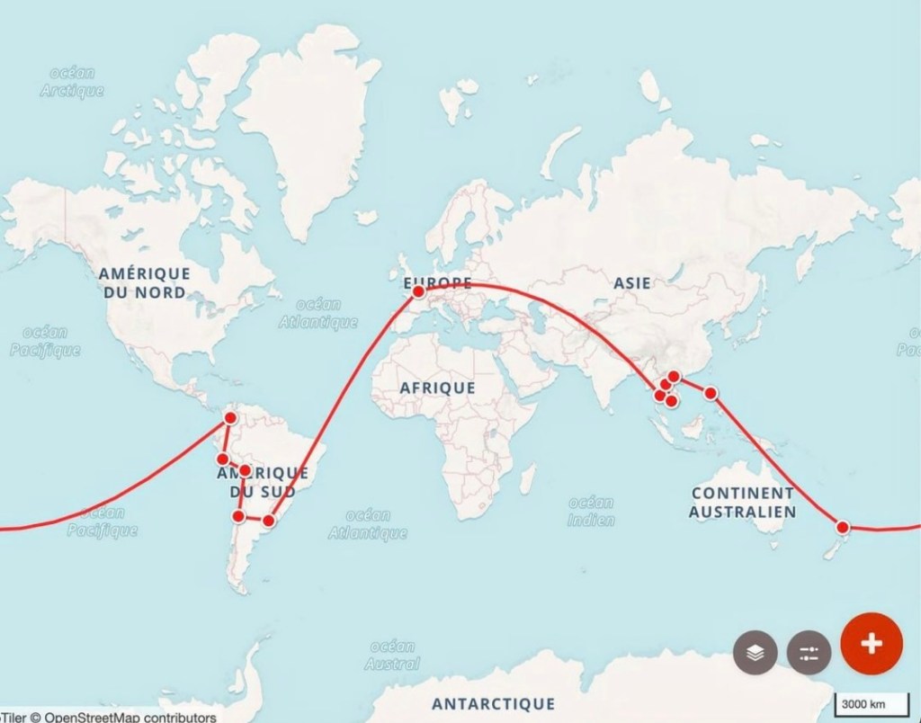 Nous commencerons en Asie du Sud-Est, plus précisément par la Thaïlande, avant de continuer par le Cambodge, le Laos, le Vietnam et les Philippines. Puis nous nous dirigerons vers la Nouvelle-Zélande, avant de traverser l’Océan Pacifique et de descendre tout le continent Sud-Américain, en passant par la Colombie, le Pérou, la Bolivie, le Chili et enfin l’Argentine.