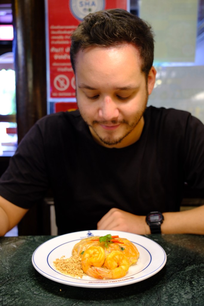Troisième et dernier jour à Bangkok. Nous nous levons un peu plus tôt que d’habitude afin d’aller visiter le grand palais, mais c’est un échec cuisant. En effet, c’est le 1er endroit où les hommes ne peuvent pas être en short, et où se couvrir les épaules avec un foulard est interdit (il faut impérativement un t-shirt). Tout ça pour nous faire acheter leurs pantalons éléphants… Nous laissons tomber, nous reviendrons mieux équipés lors de notre prochain passage à Bangkok. Nous partons à pieds pour un autre quartier, où l’on peut manger un des meilleurs pad thaï de la ville apparemment, chez Thipsamai. Guillaume commande un superb (le pad thaï est enroulé dans une petite omelette toute fine), et moi un classique. C’était un délice !