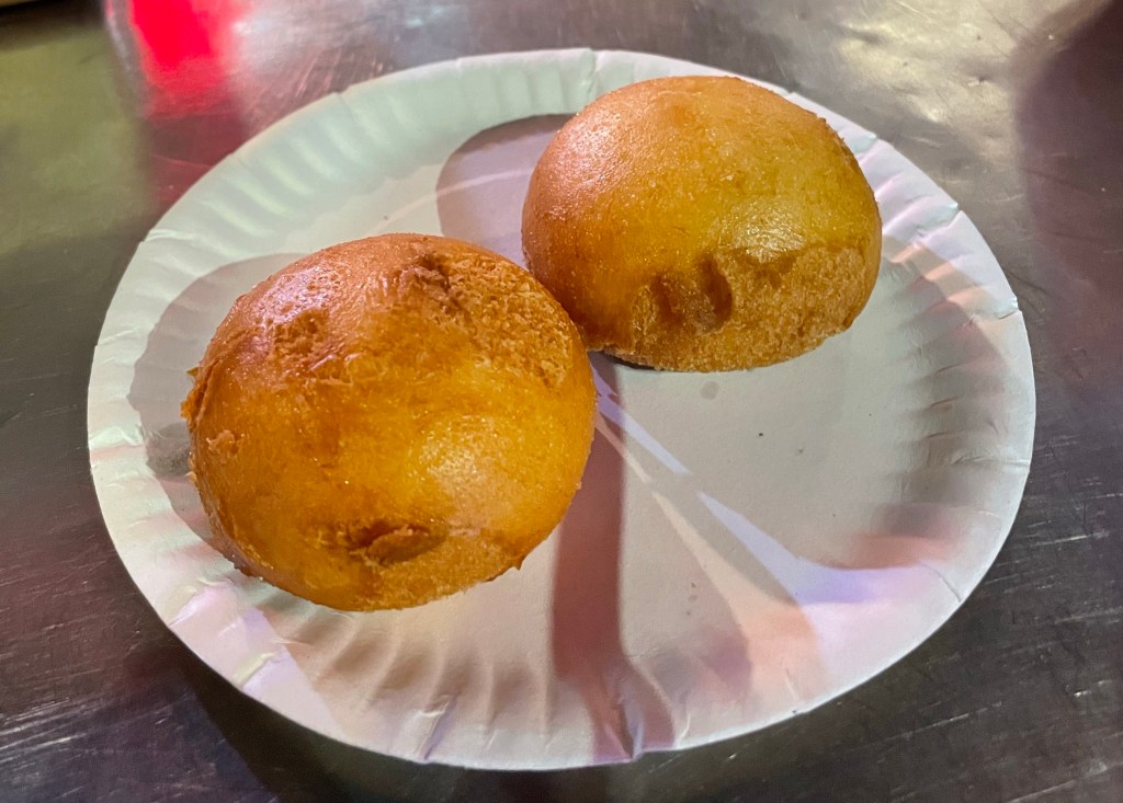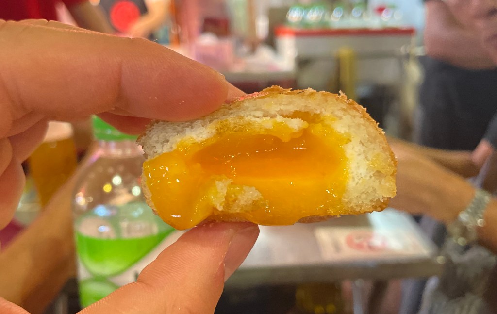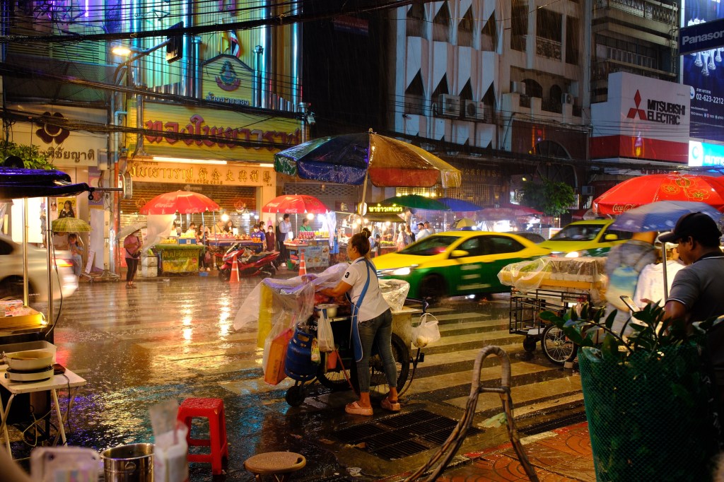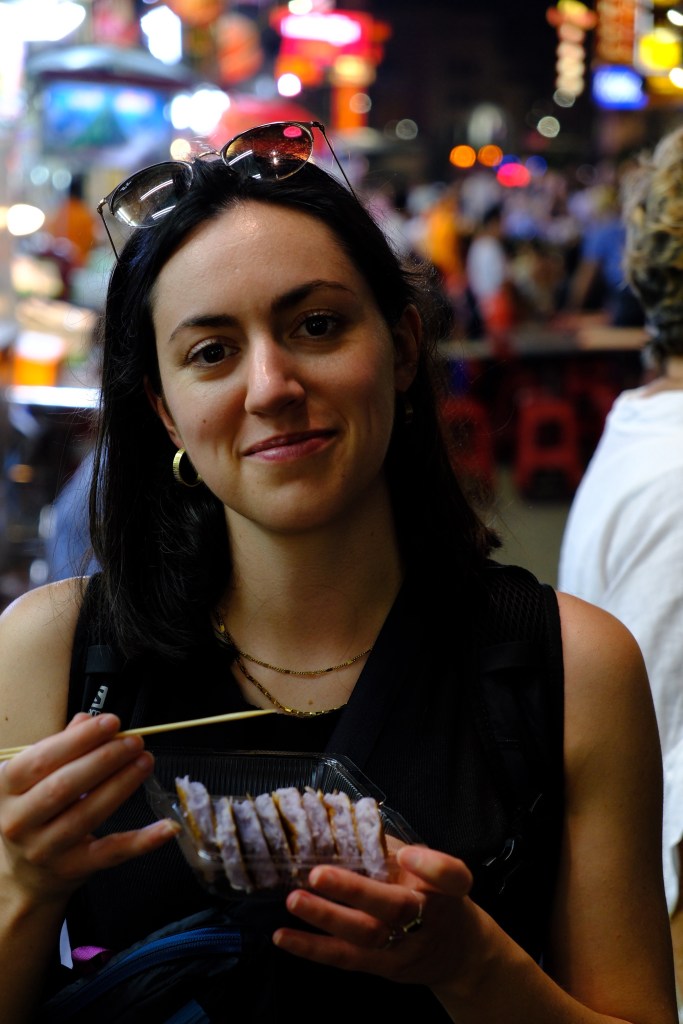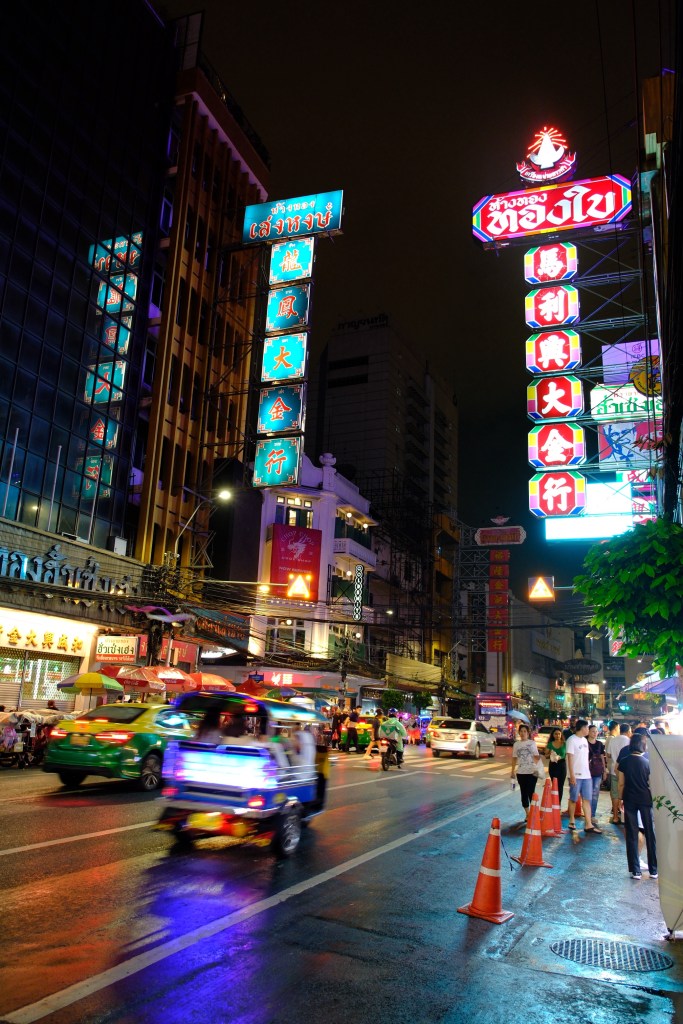 Une fois le soleil couché, nous poursuivons la soirée en direction de Chinatown. Nous prenons un tuk-tuk disco pour y aller sans se faire mouiller par la petite averse du soir. Arrivés sur place, la rue principale est toute illuminée d’enseignes chinoises, et la rue est jonchée de stands de street food, au grand bonheur de Guillaume. Nous mangeons une petite soupe de nouilles très bonne, des brochettes et un petit beignet frit avec du jaune d’oeuf coulant a l’intérieur, surprenant mais délicieux !