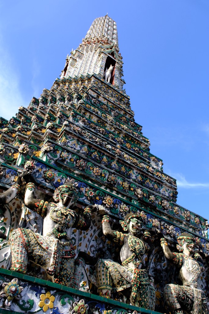Puis nous nous dirigeons vers le centre historique et ses nombreux temples, après nous être sustentés dans la rue pour 3 fois rien. Le premier que nous visitons est le Wat Arun, ou Temple de l’Aube. Son prang (tour) principal, est majestueux, tout recouvert de céramiques et de statues.