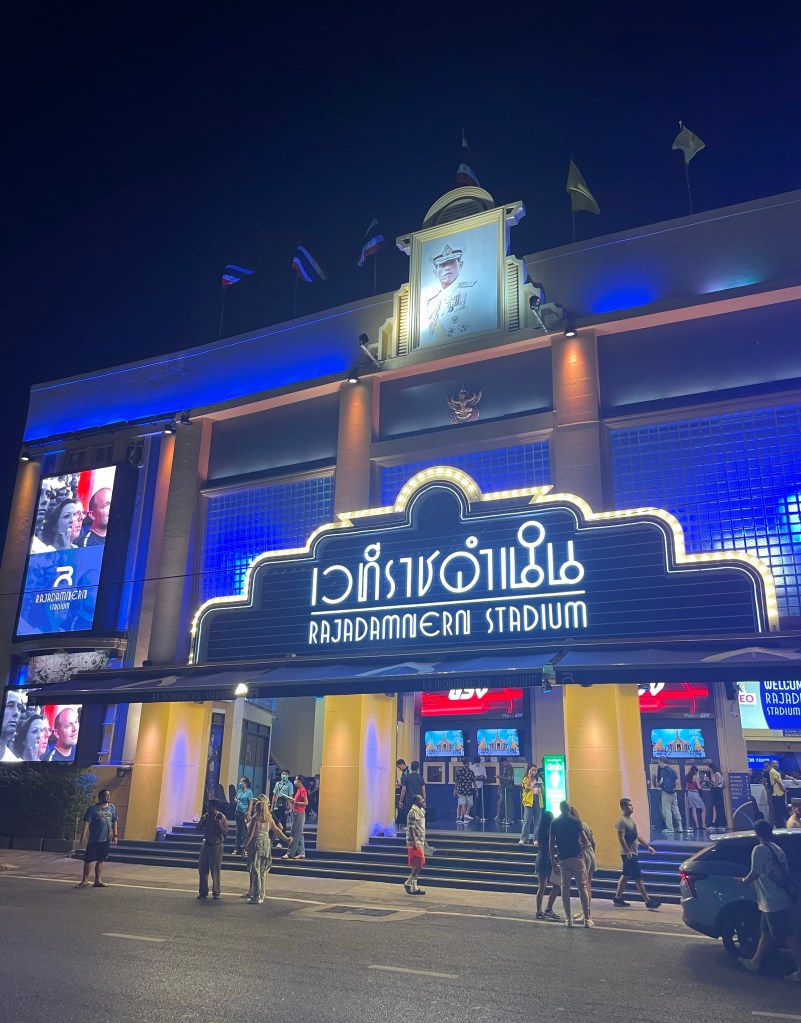 Puis, harrasés par la chaleur, nous décidons d’aller tester notre premier massage thaï. Il se pratique habillé, sur un futon, et associe des pressions sur les muscles et des manipulations des articulations. Une adresse trouvée au hasard (Chingcha Thai Massage), et le massage était divin. À la fois ferme et relaxant, tous nos muscles étaient détendus en sortant, c’était parfait. Nous avions ensuite réservé notre soirée pour aller voir des combats de boxe thaï (muay thaï) dans le principal stade du pays, et donc du monde, Rajadamnern Stadium. Comme tout bons supporters nous avons mangé des hot dogs et bu de la bière, et nous avons passé une excellente soirée ! Même pour des novices comme nous, c’était très intéressant à regarder, et l’ambiance était très sympa.