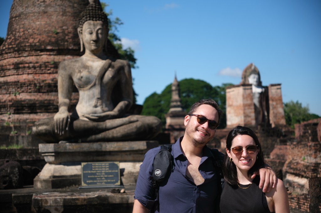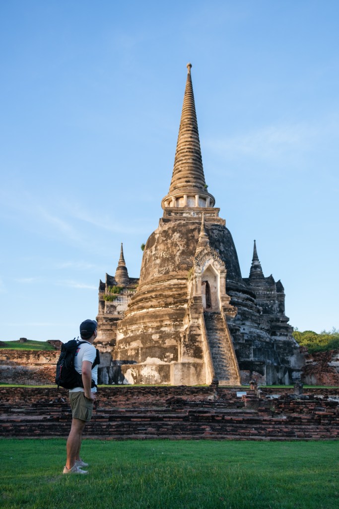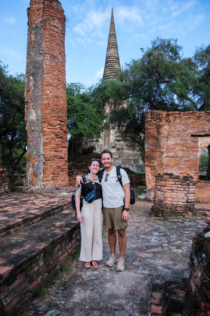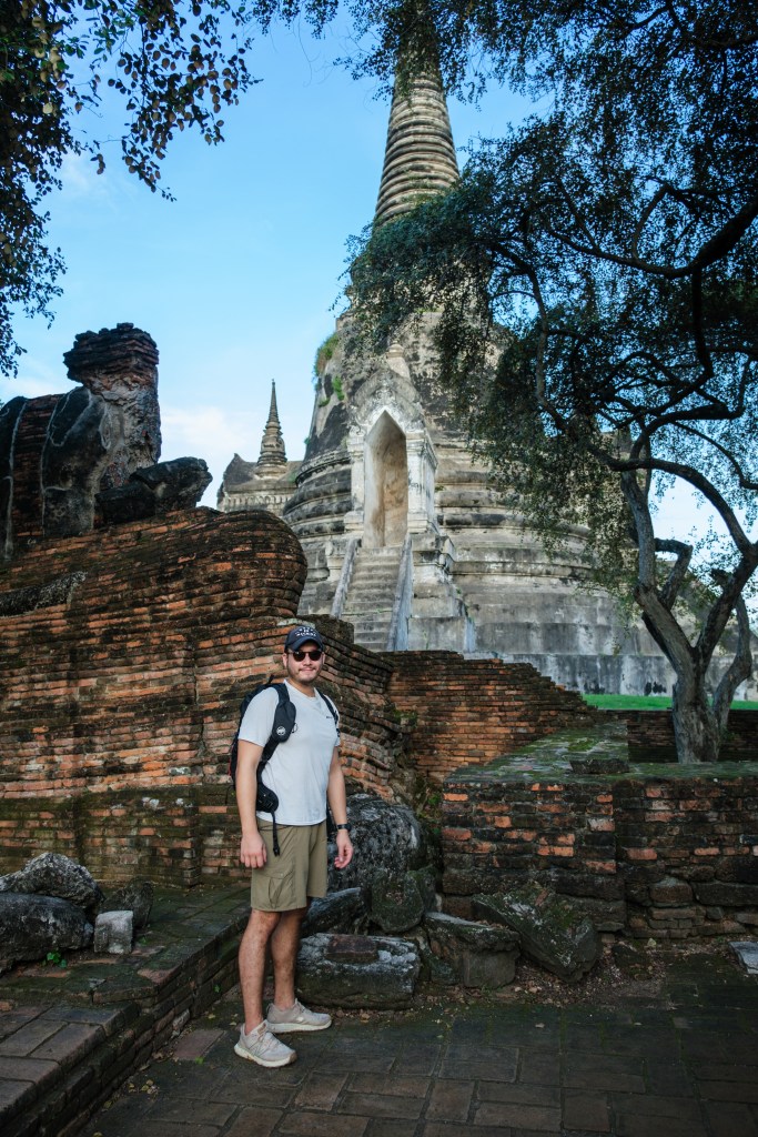 Sur le chemin du Nord, nous nous rendons à Ayutthaya, petite ville au nord de Bangkok et ancienne capitale du Royaume de Siam. Nous prenons le train depuis Bangkok pour 1h30 de trajet sur des sièges en plastique, sous 30°C. Il y a plusieurs classes disponibles dans les trains thaïlandais : la 1ère et la 2ème classe sont plus confortables et climatisées, et la 3ème classe est plus rustique avec des ventilateurs et une place assise pas forcément garantie. Comme nous achetons notre billet le jour même, il n’y a plus que des places en 3ème classe, nous voyageons donc comme les locaux. Arrivés en début d’après-midi à Ayutthaya, nous déposons nos sacs à la guesthouse et partons découvrir la ville. Sur le chemin, nous nous arrêtons déjeuner dans un petit restaurant de bord de rue « Lung Lek Boat Noodle ». Nous avons pris une soupe de nouilles au bœuf, qui était excellente, le bouillon était riche et épais, plein de saveurs et se mariait extrement bien à la fraîcheur du soja et basilic thaï. Nous avons également pris de très bonnes brochettes de porc a la sauce satay (cacahuètes) avec du riz. Après ce délicieux repas (notre meilleur depuis le début du voyage !), nous partons repus en direction des différents sites classés au patrimoine mondiale de l’Unesco.