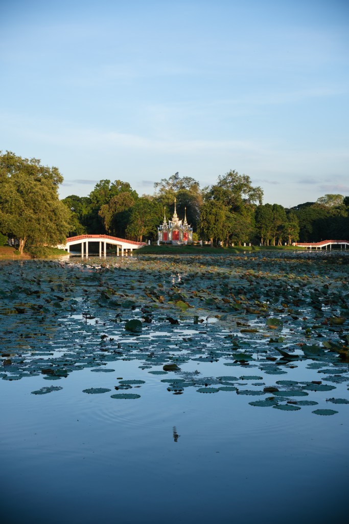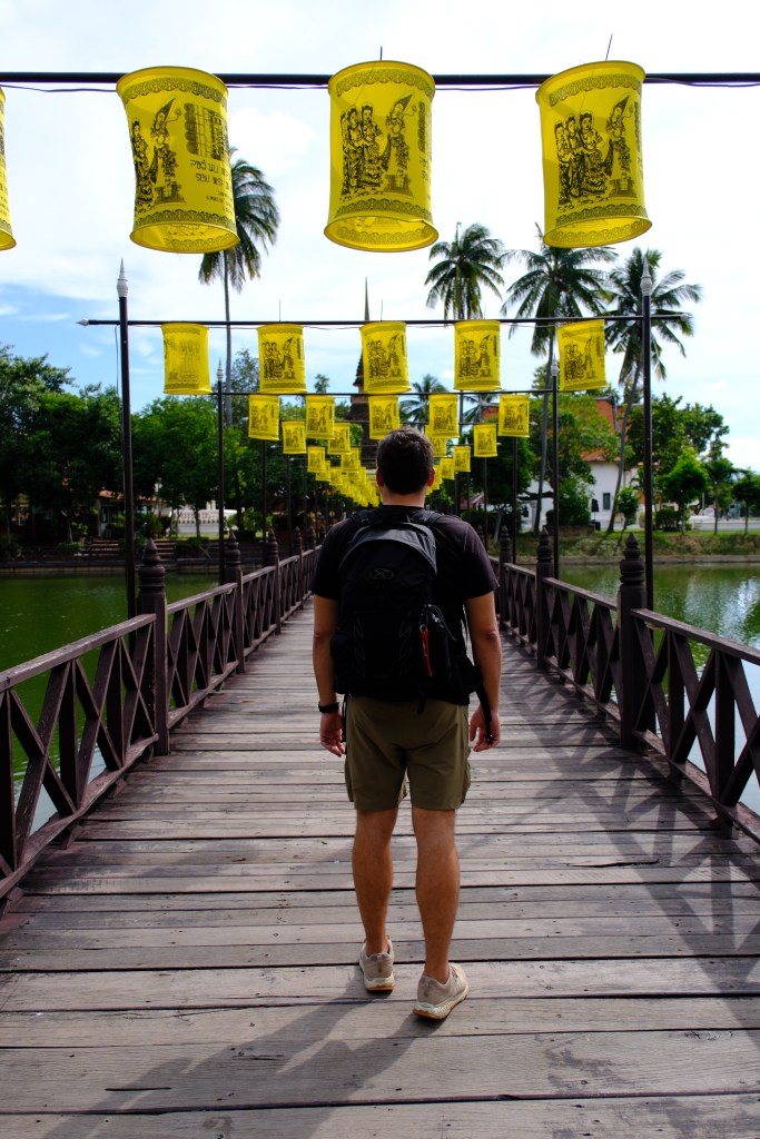 Puis nous déjeunons dans un petit restaurant typique et retournons voir un dernier temple pour la journée, le Wat Si Chum. Il est reconnaissable par son grand Bouddha assis de 14m de haut, visible à travers une faille dans mur, sur les mains duquel les fidèles viennent déposer des feuilles d’or. Le soir, nous prenons de quoi grignoter à des stands de street food dans la rue, et allons s’installer sur des petites tables au bord du lac, entourés de lanternes.
