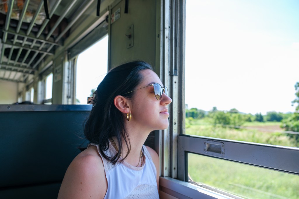 Le lendemain, notre premier périple de transport commence, afin de rallier Sukhothai. Notre peu d’organisation nous joue des tours car tous les bus directs sont pleins, il nous reste donc l’option du train. Nous prenons le train à 8h30 et pour une durée d’environ 6h, jusqu’à Phitsanulok, où il nous faudra prendre un bus jusqu’à la ville de Sukhothai. Toujours adeptes de la 3ème classe, nous sommes cette fois beaucoup mieux installés, nous n’avons pas de voisins et pouvons nous étaler sur les banquettes. Guillaume s’occupe de trier les photos, j’en profite pour écrire l’article sur Bangkok. Et nous lisons, interrompus régulièrement par les cris des vendeurs ambulants du train, qui proposent brochettes, plats complets dans des petits sacs plastiques, et boissons en tout genre (au plus grand bonheur de Guillaume).