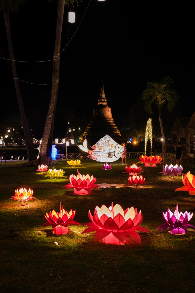 Arrivés à Sukhothai dans l’après-midi, nous posons nos affaires dans notre nouvelle auberge, située proche du parc historique. Le petit papi qui la tient nous apprend que le grand festival du Loy Krathong a lieu dans quelques jours, et que pour l’occasion, le parc sera tout illuminé ce soir. C’est le plus grand festival du pays, il a lieu une fois par an, lors de la pleine lune du 12ème mois du calendrier lunaire. Lors de cette fête, les habitants allument des lanternes et les posent sur des krathongs, des petits radeaux qui sont déposés dans la rivière. Cela symbolise l’abandon des rancunes et des colères afin de recommencer l’année d’un bon pied. Nous sortons donc nous promener et admirons les centaines de lanternes en papiers qui illuminent le jardin, ainsi que les jeux de lumières sur les temples, c’est féerique.