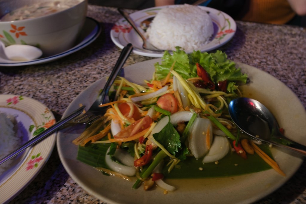 Journée de transit aujourd’hui, notre bus pour Chiang Mai est à 16h. Nous en profitons pour nous reposer à l’auberge qui est très agréable. Nous allons flâner au marché en fin de matinée. Guillaume avait, comme d’habitude, envie de tout acheter. Il a pris une sorte de pork jerky, caramélisé avec des graines de coriandre, très bon. À midi nous retournons manger dans notre restaurant du premier soir, que nous avions bien aimé. On y trouve des currys, des soupes, des plats de riz et de nouilles qui sont très bons. Puis nous prenons le bus pour 6h de route en direction de Chiang Mai. Sans surprise, la climatisation est trop forte, mais le bus est plutôt confortable et le trajet passe vite, entre sieste et lecture. Nous avons réservé un trek de 3 jours dans la jungle au nord de Chiang Mai, départ demain matin.