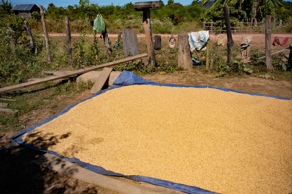 Nous sommes seulement tous les deux, et accompagnés par Pat, notre guide cambodgien qui parle très bien anglais, et Teng le ranger. Teng fait le trek en claquettes, et son sac à dos est un sac de riz avec des bretelles. Nous traversons d’abord des rizières sèches (la récolte du riz a lieu au mois de novembre, au début de la saison sèche), des champs de sésame et de manioc en cours de récolte et de séchage, d’autres où paissent des buffles.