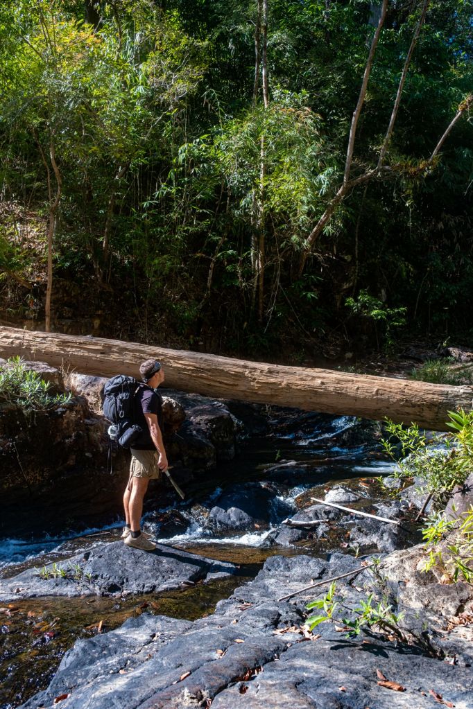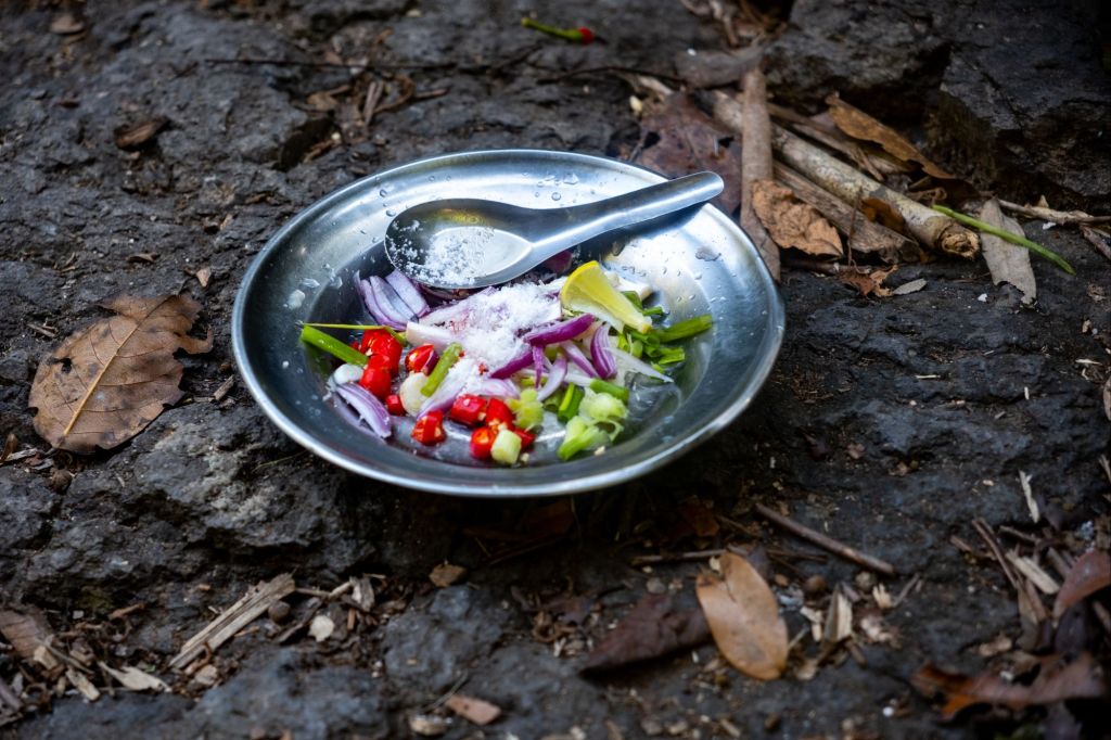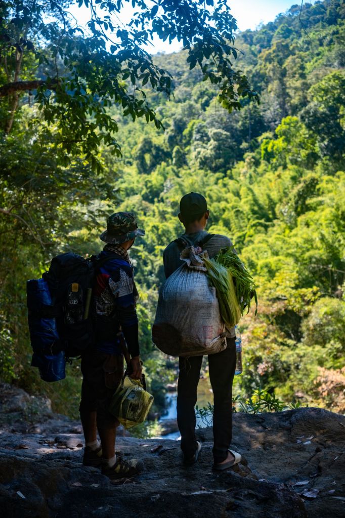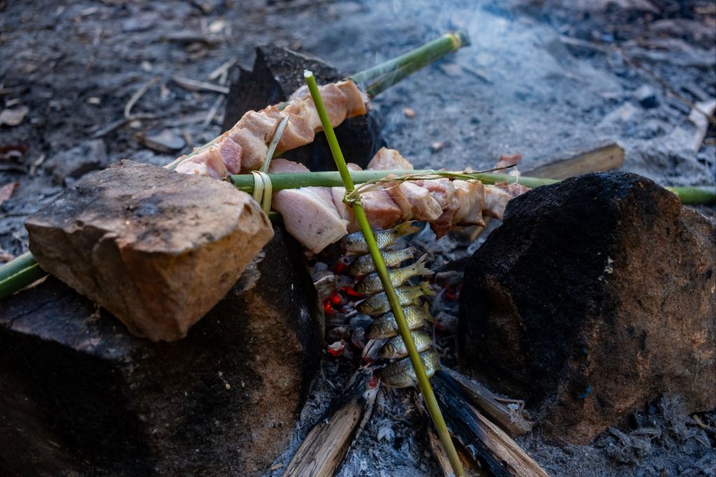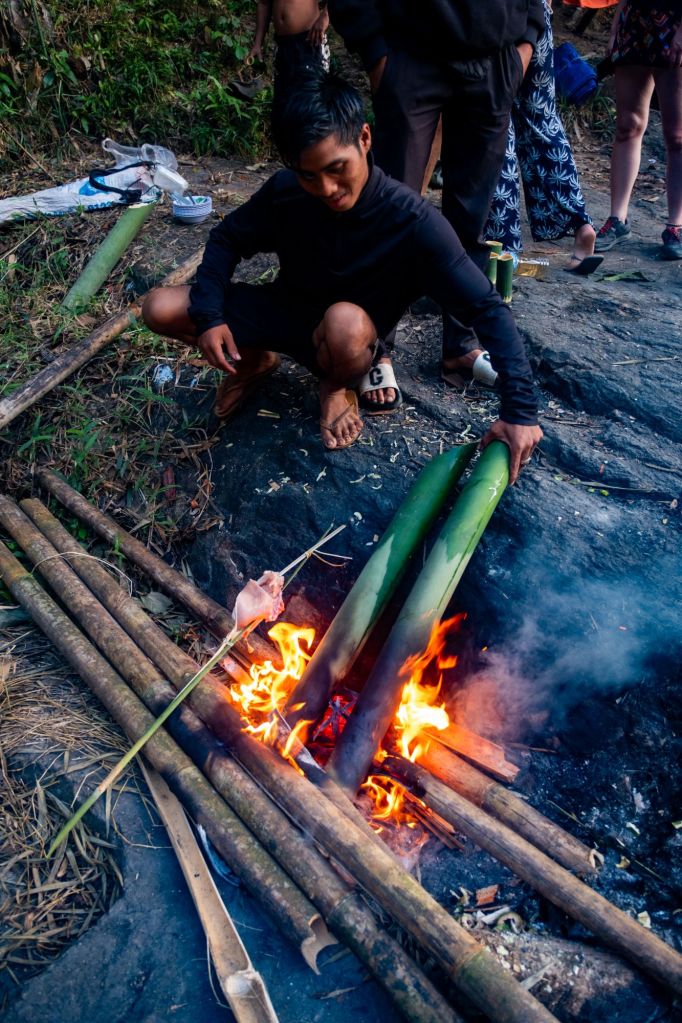 Pendant que nous nous baignons dans des petites piscines naturelles à l’eau rafraîchissante, nos guides s’affairent déjà pour préparer le feu et le repas du soir. Ils aiment bien cuisiner, nous avons donc transporté des casseroles, des légumes et du riz pour se faire à manger pendant ces 3 jours. Nous aidons à la découpe des légumes qui seront cuits dans des bambous directement sur le feu, pendant que Pat va tendre des filets dans la rivière pour espérer manger du poisson au petit déjeuner.