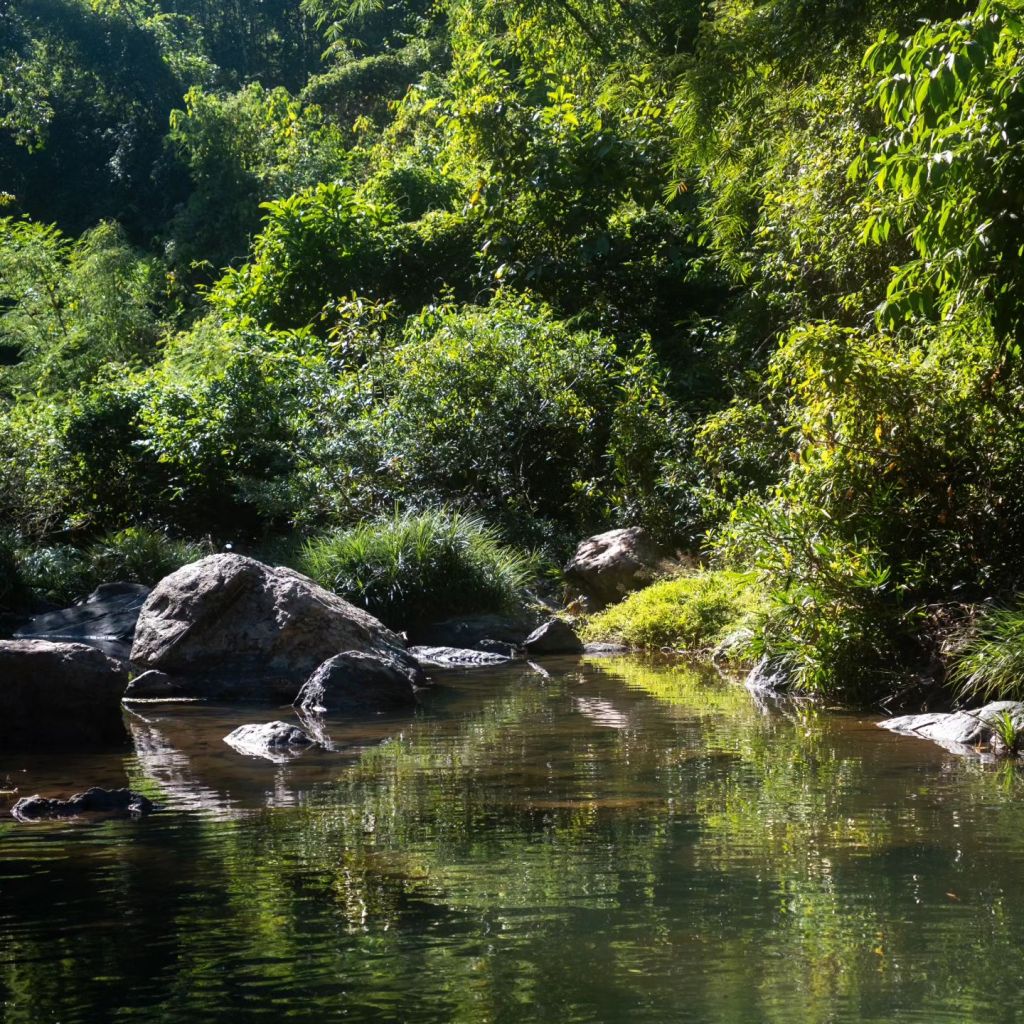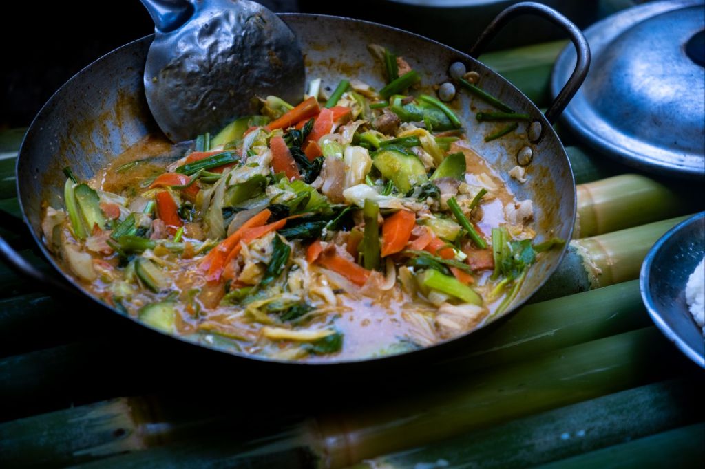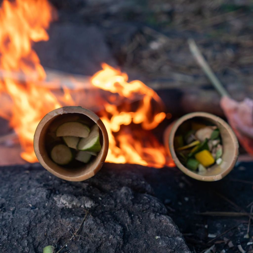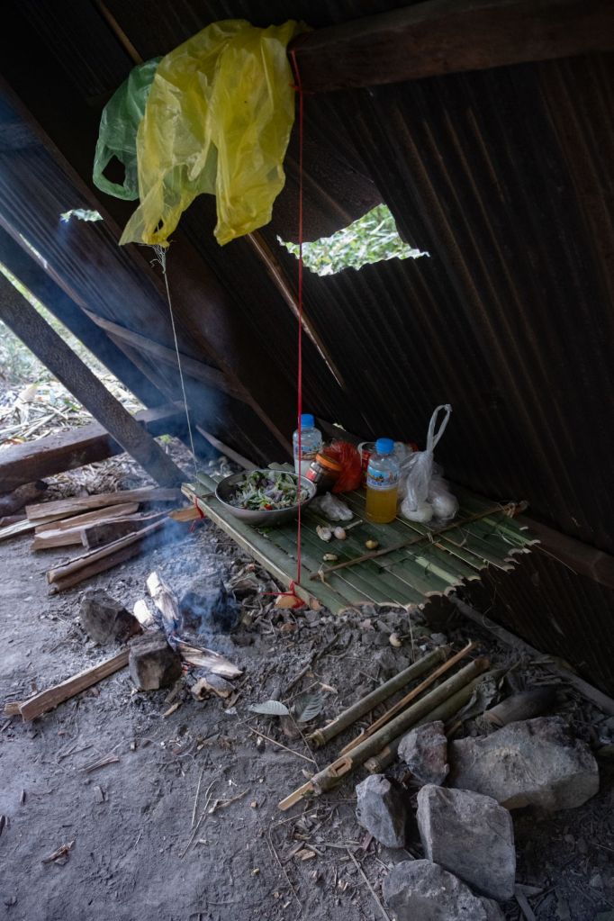 Pendant que nous nous baignons dans des petites piscines naturelles à l’eau rafraîchissante, nos guides s’affairent déjà pour préparer le feu et le repas du soir. Ils aiment bien cuisiner, nous avons donc transporté des casseroles, des légumes et du riz pour se faire à manger pendant ces 3 jours. Nous aidons à la découpe des légumes qui seront cuits dans des bambous directement sur le feu, pendant que Pat va tendre des filets dans la rivière pour espérer manger du poisson au petit déjeuner.