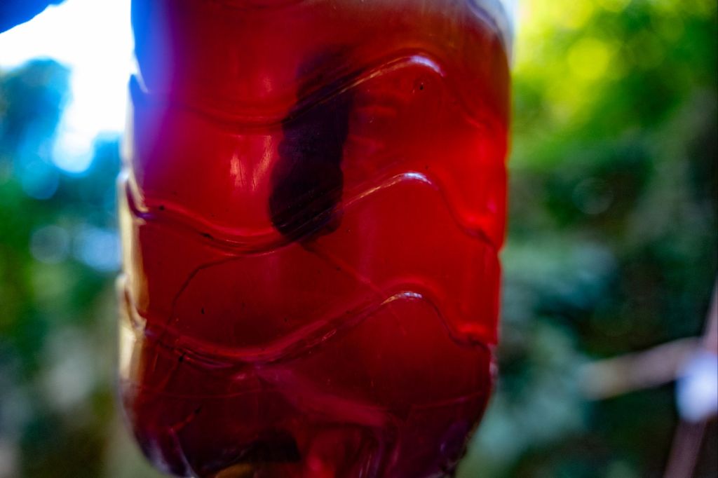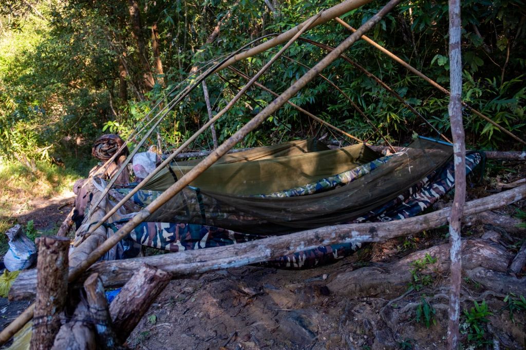 La pluie s’invite après le repas, et nous nous réfugions sous notre abri. Puis nous entendons du remue-ménage : Teng a attrapé un énorme scolopendre de 20cm, c’est rare d’en voir des si gros, et sa morsure est apparemment très douloureuse ! Ni une ni deux et nos deux guides le glissent vivant dans une des bouteilles de « happy water », car son poison dilué dans l’alcool donnerait force et vigueur (masculine notamment). Nous filons ensuite nous coucher dans nos hamacs, fatigués de cette première journée.