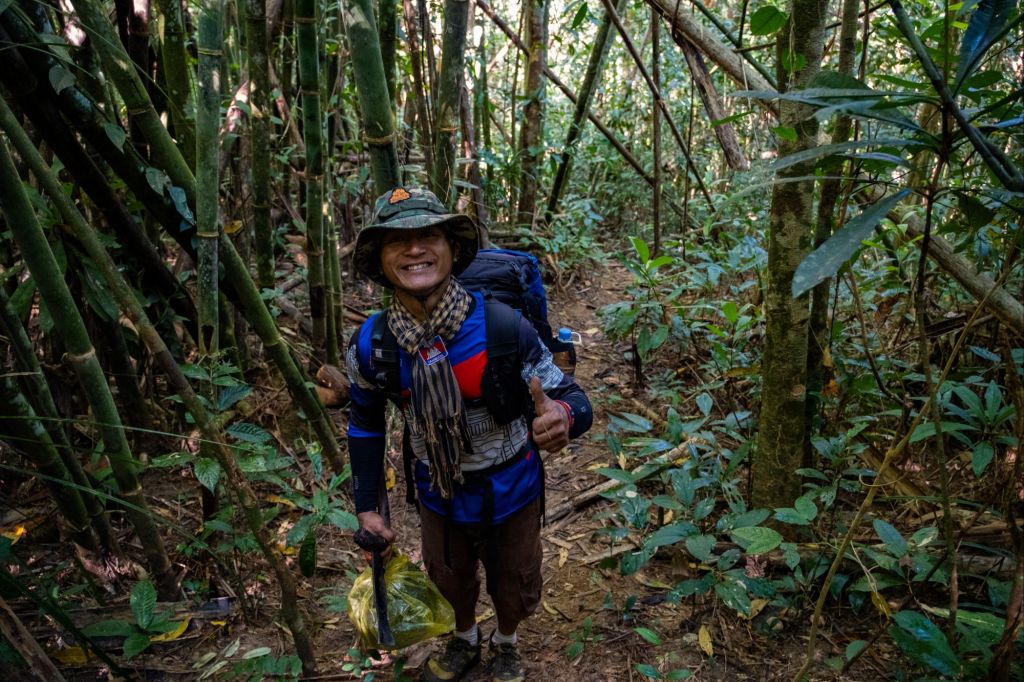 Puis nous arrivons aux abords de la jungle, tantôt composée de fougères, des bambous et de grands arbres d’où pendent des lianes. Nous marchons une dizaine de kilomètres dans les petits sentiers, débroussaillés à la machette par nos guides (et Guillaume, qui en a acheté une avant de partir !).