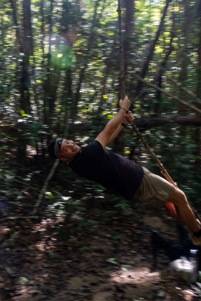 À midi, nous nous arrêtons manger au bord de l’eau. Nous pouvons nous rafraîchir, avant le déjeuner de riz et de poisson. Nous reprenons la route. Sur le chemin, une petite balançoire a été construite sur une liane. Nos guides décident de créer un nouveau chemin, nous passons donc à travers la jungle, et les hommes débroussaillent à la machette pour que nous puissions passer, au plus grand bonheur de Guillaume.