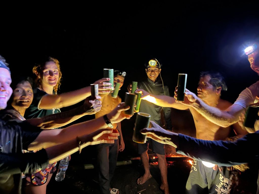 Nous dînons avec nos voisins de camp, des français (et certains dont vous entendrez de nouveau parler plus t, et buvons de la « happy water » que nos guides ont ramené. C’est un alcool de riz artisanal typique du pays, tournant aux alentours des 50⁰. Il accompagne parfaitement les fines tranches de peau de buffle séchée et grillée au barbecue.