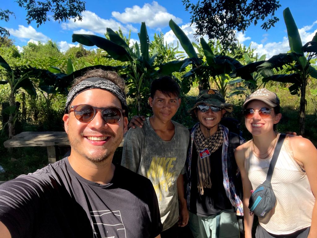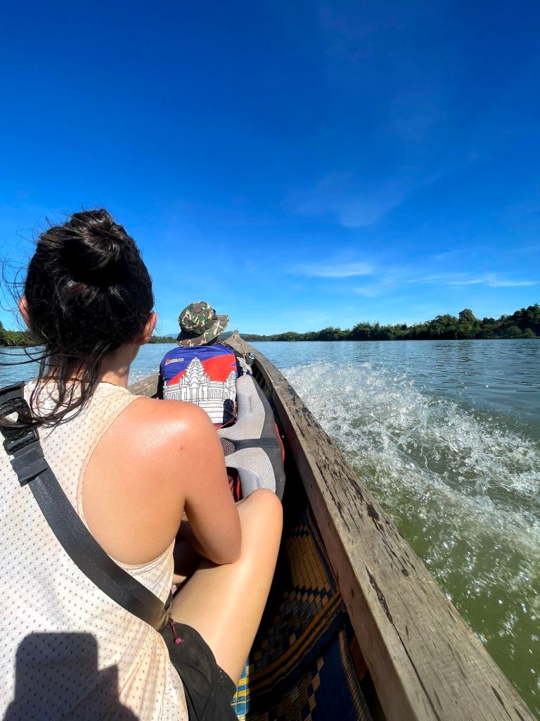 Premier jour de trek aujourd’hui. Nous prenons un bon petit déjeuner cambodgien, c’est une petite omelette fine fourrée avec des pousses de soja. Nous partons pour une heure de route en tuk-tuk sur une piste de terre ocre poussiéreuse, puis 30 minutes de long tail boat, et nous arrivons au départ de la randonnée.