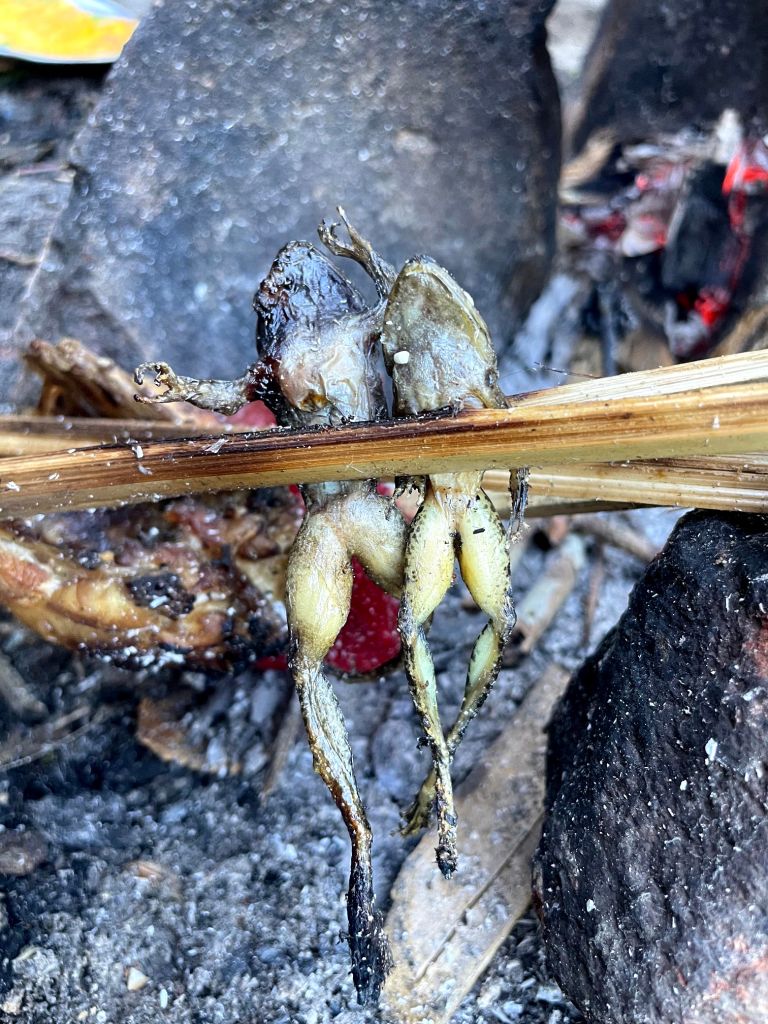 Le 2ème jour commence par un bon petit déjeuner de poissons frits (la pêche à été fructueuse), d’omelette et de pain. Nous quittons le camp pour s’enfoncer un peu plus dans la jungle. Notre guide nous montre les plantes comestibles, et notamment les arbres et lianes à eau, où l’on peut boire directement après les avoir coupés. Il nous fait également goûter des petits fruits acidulés et des plantes qui peuvent se manger crues ou être infusées pour faire du thé. Il ramasse d’ailleurs régulièrement de quoi agrémenter les sauces et les plats qu’il nous concocte.