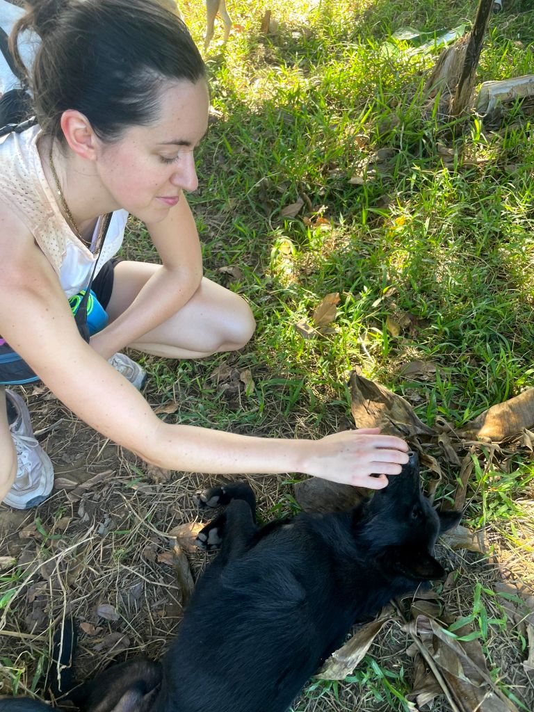 Nous arrivons en milieu d’après-midi à notre camp pour la nuit, au bord d’une rivière. Il y a 3 camps composés de quelques bambous formant l’ossature d’une petite maison, sur laquelle notre guide dépose une bâche (en cas de pluie), et où nous suspendons nos hamacs pour la nuit. Nous sommes accompagnés de Barbecue, un petit chien noir tout gentil qui suit les groupes de randonneurs et déguste la fin de leurs repas.