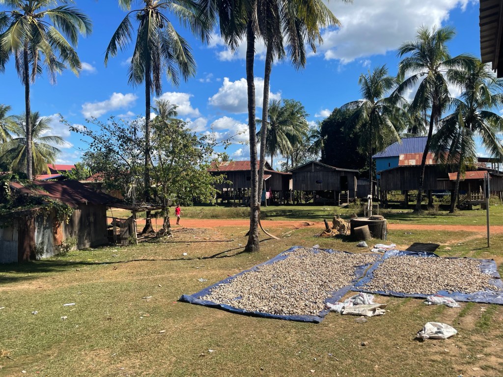 C’est parti pour 8h de transport dans un minivan en direction du nord-est du pays, dans la campagne du Ratanakiri. Notre chauffeur conduit comme un fou sur les pistes poussiéreuses et pleines d’ornières du Cambodge. Le trajet est long, ponctué d’arrêts dans des petits restaurants de bord de route, où nous mangeons notre pique-nique (un petit sandwich de délicieux pâté Hénaff miraculeusement trouvé dans un supermarché pour 5$). Nous arrivons vers 16h à Banlung, et nous allons me faire faire des photos d’identité dans une petite boutique de photo, pour le passage de la frontière laotienne. Puis un tuk-tuk vient nous chercher pour nous emmener à l’auberge, le Ratanakiri homestay. C’est avec eux que nous avons organisé notre trek pour les 3 prochains jours. L’auberge est très mignonne, avec des petits bungalows dispersés au milieu d’arbres de la jungle, et tout le mobilier est en bois. On y mange avec la famille une cuisine locale délicieuse et les enfants jouent au milieu de tout le monde. Nous y rencontrons un groupe de français qui revient du trek, avec qui nous passons une très bonne soirée à boire des bières et à jouer aux cartes. Nous avons appris qu’il est possible de gagner des canettes gratuites, voire même des scooters ou des voitures sous les opercules des canettes de Cambodia !