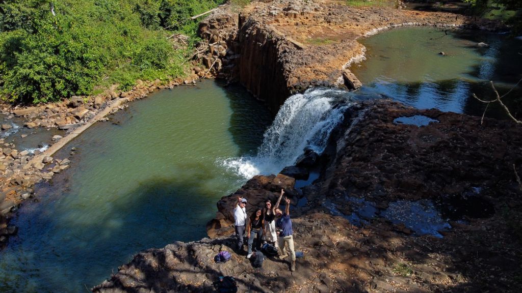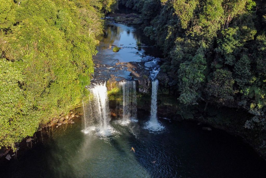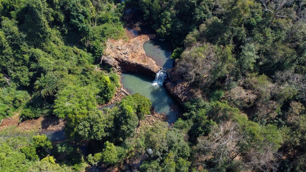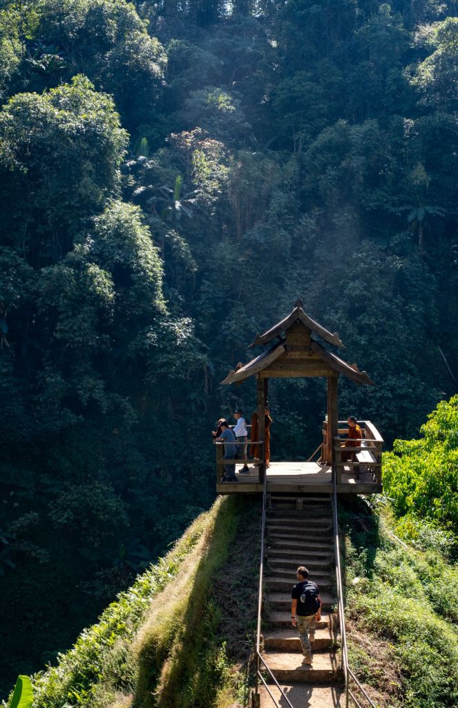 Après avoir roulé une petite heure, nous nous arrêtons à une petite cascade (Pha Suam) dont les infrastructures sont toutes abandonnées, mais où nous avons le mérite d’être seuls. Nous nous trouvons un bassin où nous baigner et où sauter depuis la falaise, c’est une pause très rafraîchissante. Nous en profitons pour faire voler le drone et capturer quelques images de la cascade depuis le ciel.