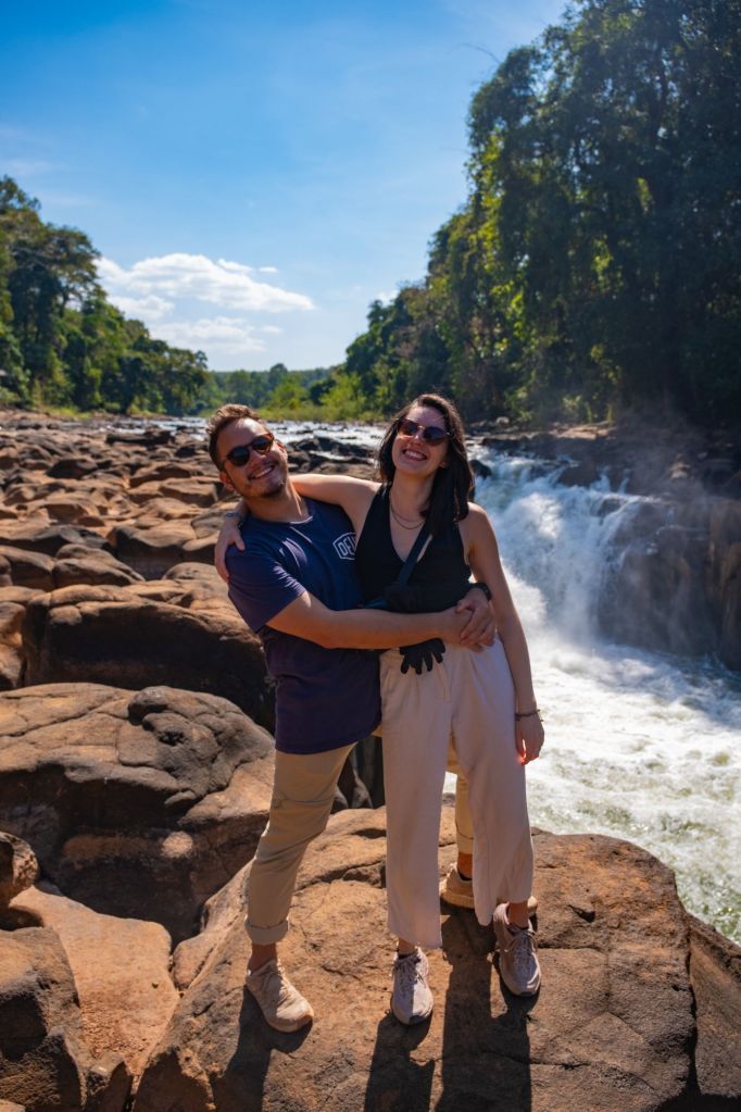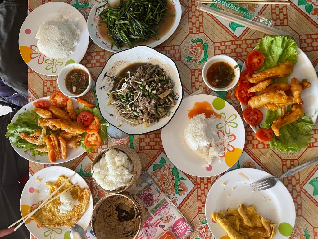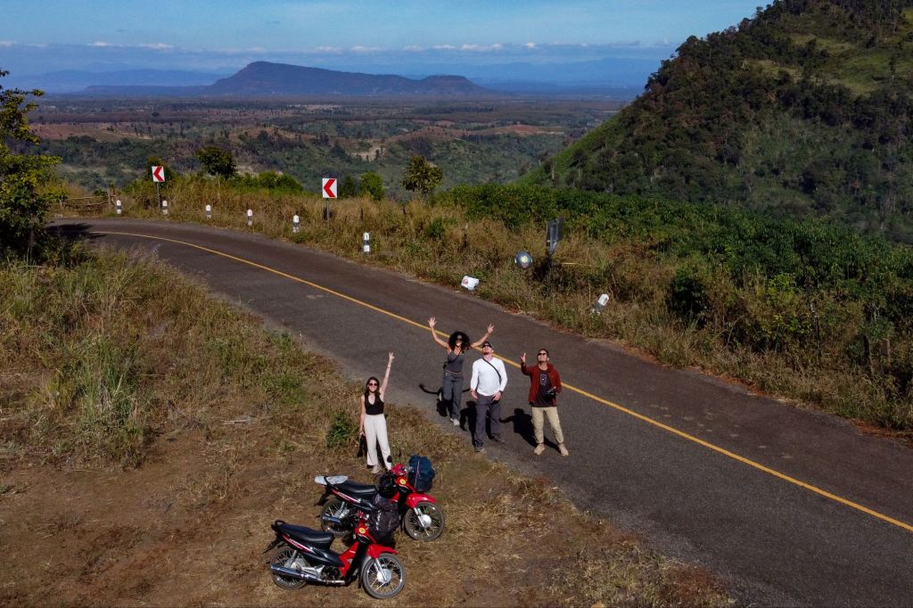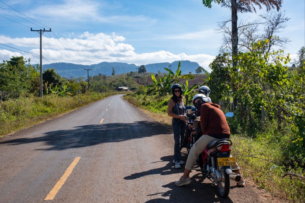 Après un bon petit déjeuner de pâtes au bleu (nous sommes constamment en craving de fromage) faites maison dans notre auberge, nous partons avec nos nouveaux compagnons de voyage, Amélie, Christophe, Maïa et Boni, en direction de Paksé.