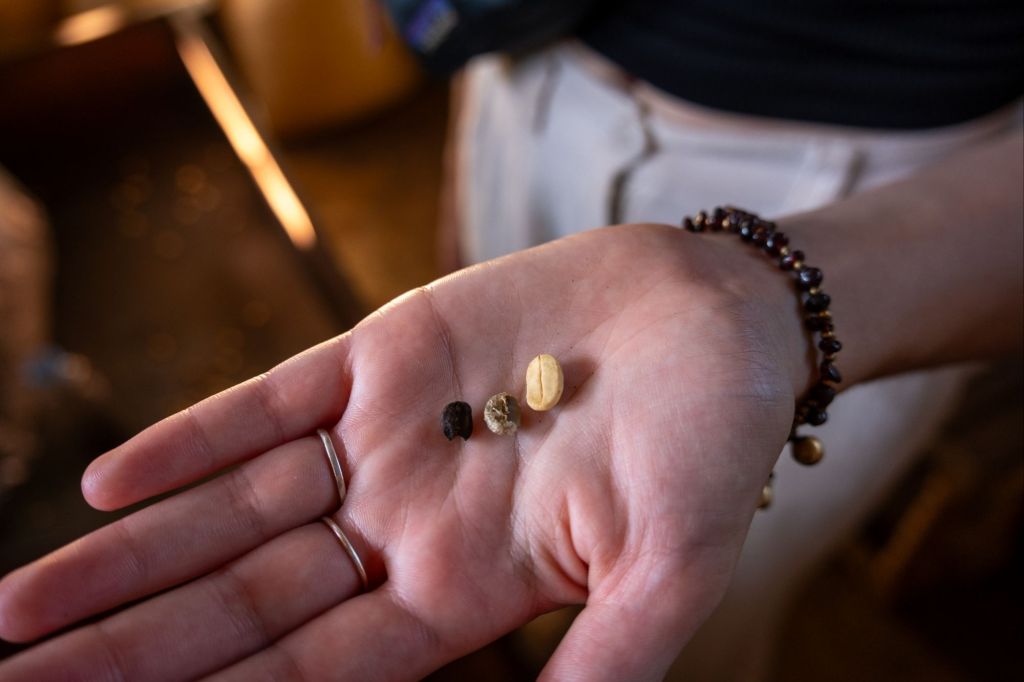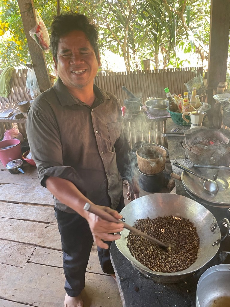 Nous poursuivons notre route au milieu des petits villages où les habitants vivent très modestement, et où tous les enfants agitent les mains quand nous passons. Tout le monde est souriant et nous salue de “Hello” et de “Sabaidee”ippllm. Le deuxième arrêt est la plantation de café de Mr Vieng. Nous visitons sont exploitation, et il nous explique toutes les étapes depuis la plantation du café à la récolte et la torréfaction. Il cultive différentes variétés, dont l’arabica, le robusta et le liberica. Après la récolte, le café est séché au soleil puis torréfié dans un four. C’est la seule personne du village à en posséder un, et il torréfie lui-même la plupart du café des autres plantations.