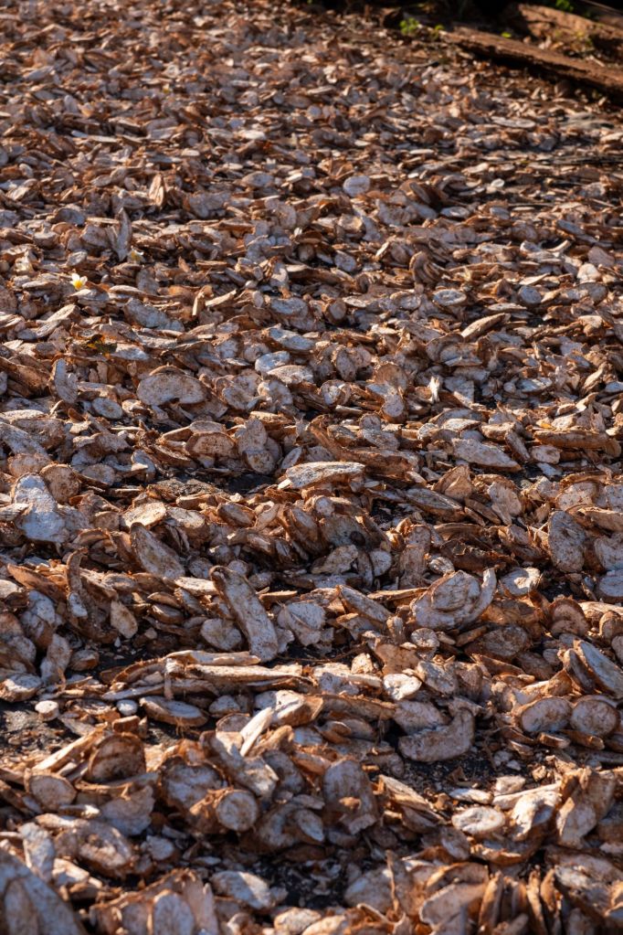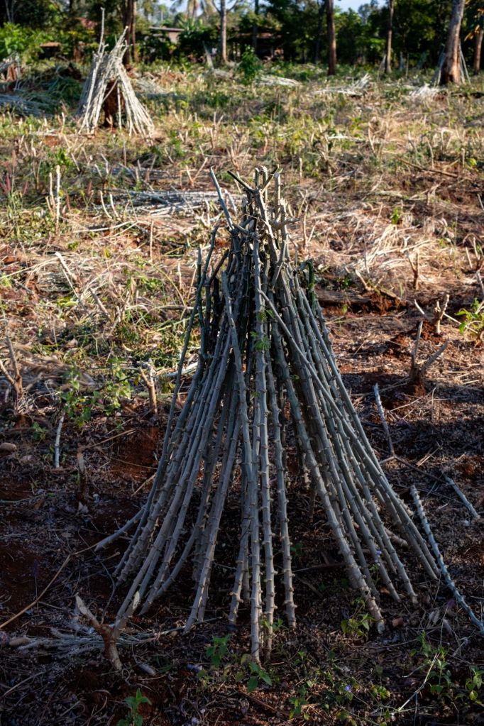 Après un bon petit déjeuner de soupe de nouilles et une montagne de pancakes avec du Nutella maison (lait concentré sucré mélangé à du chocolat en poudre), nous quittons Amélie et Christophe. Ils restent une journée de plus chez Somphone, pendant que nous rentrons sur Paksé ce soir. La route nous fait passer au milieu de petits villages et de champs de manioc, une des cultures principales de la région. D’ailleurs, au bord de la route il y a des petits panneaux avec le cours actuel du manioc, frais ou séché, qui change chaque semaine. Le manioc a une culture particulière : lorsqu’il est récolté, seule la racine est utilisée et séchée pour la consommation. Le tronc de l’arbre à manioc est conservé par petits tas, et sera remis en terre à la prochaine saison, pour redonner un nouveau plant de manioc. Il nécessite très peu d’eau et est donc beaucoup cultivé dans les régions très arides ou pendant la saison sèche.