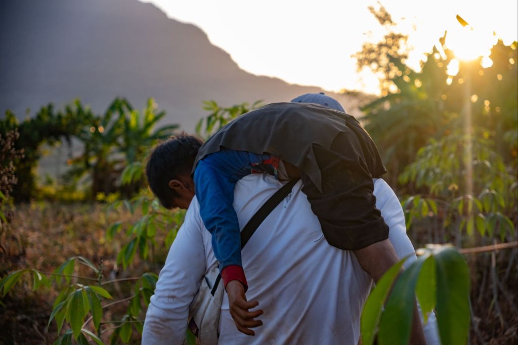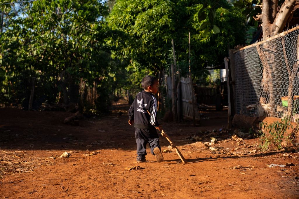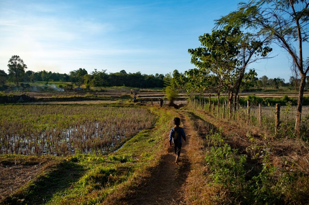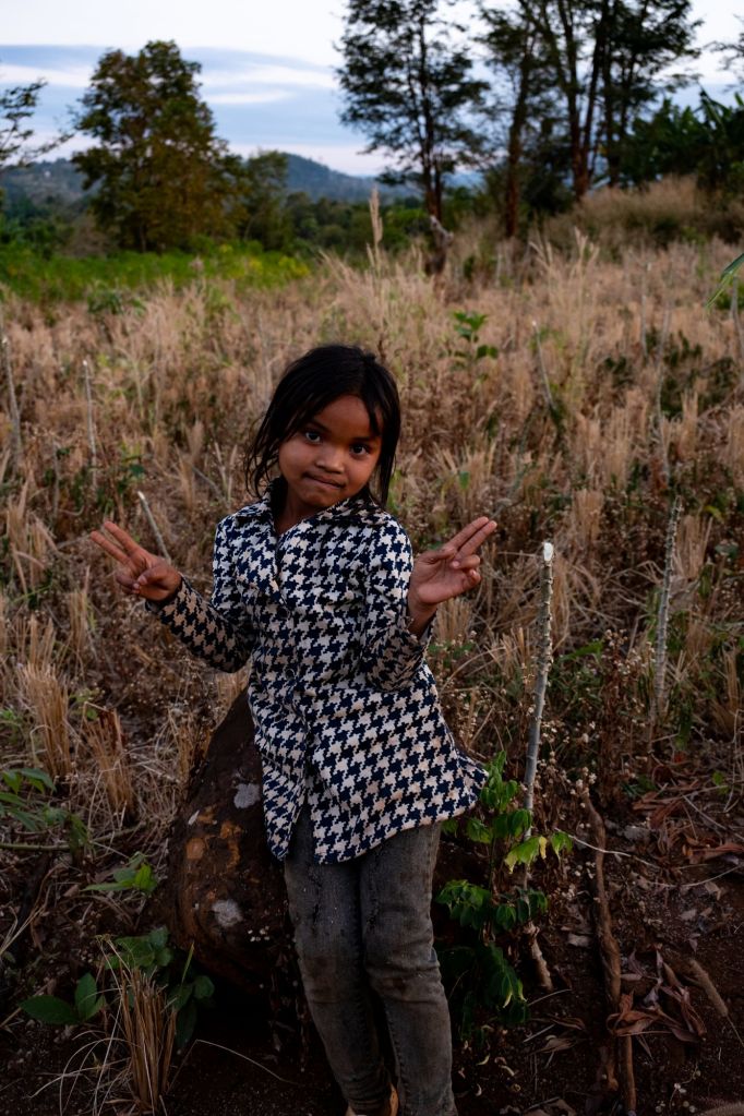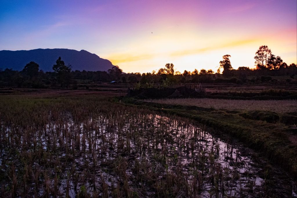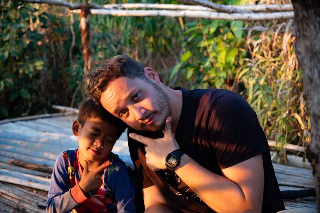 Nous arrivons en fin d’après-midi chez Somphone, notre homestay du jour. C’est un logement dans une famille, où nous partageons leur vie pour la soirée. Les enfants nous emmènent nous promener pour admirer le coucher du soleil. Ils passent leur temps à nous faire des blagues, se cacher, et nous jouons avec eux sur le trajet. Guillaume sort son drone pour capturer la golden hour, et ce gadget passionne les enfants.