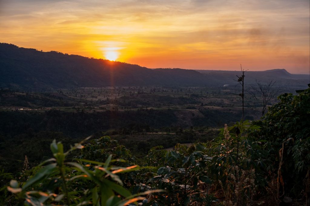 Après la visite, nous poursuivons vers Tad Lo, où nous dormons ce soir. Nous avons réservé chez Fandee Island, c’est une petite île avec des cabanes en bois nichées dans les arbres ou au bord du lac. Nous arrivons dans les lueurs du soleil couchant, et c’est vraiment magnifique !