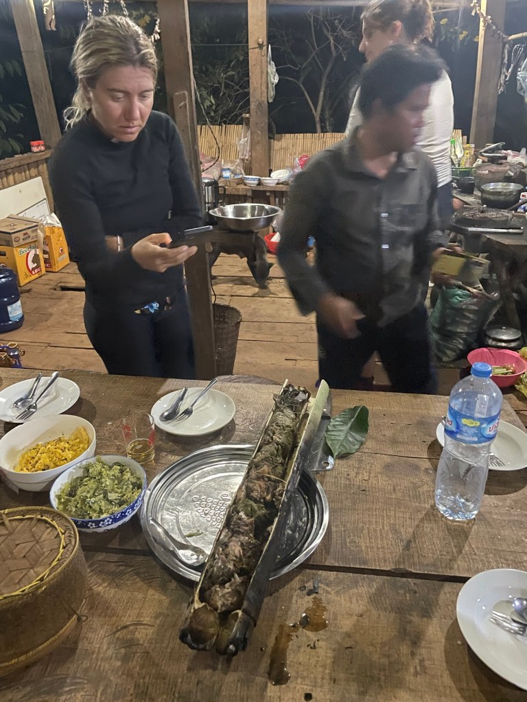 Nous rentrons à temps à la maison pour les aider à cuisiner. Christophe est à l’atelier plumage de poulet, tandis que nous nous installons à même le sol pour découper les légumes dans des grands plats. Nous mettons les légumes et le poulet dans des bambous qui sont placés directement dans le feu. Nous dînons tous ensemble à table, et discutons avec Somphone et sa femme. Le confort est assez spartiate, nous dormons dans une petite chambre toute simple, et la salle de bain commune est dehors. Mais il y a l’eau chaude, et quasiment tout le village vient d’ailleurs se doucher chez eux pour cette raison !
