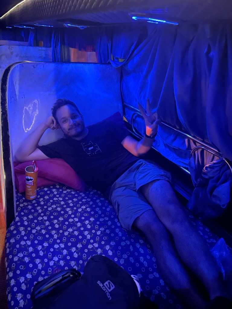 Cette fois c’est à mon tour, je vomis toute la nuit. Après avoir déjà décalé une fois, nous maintenons le bus du soir, et je passe la journée allongée dans le hall de l’hôtel après avoir rendu les clés de la chambre. Le soir, je me sens un peu mieux et nous découvrons notre bus : le grand luxe par rapport à celui du Cambodge, nous sommes ravis ! La couchette a une taille suffisante pour deux, il y a des toilettes, c’est royal ! Direction Vang Vieng, pour découvrir les magnifiques paysages du nord.