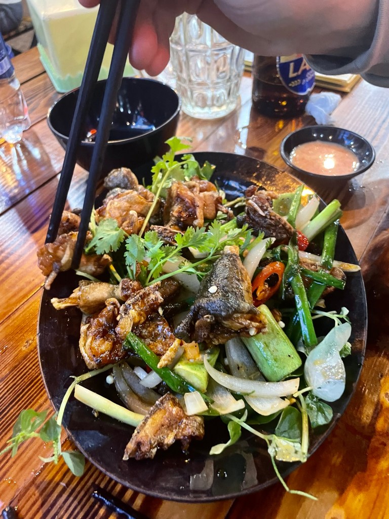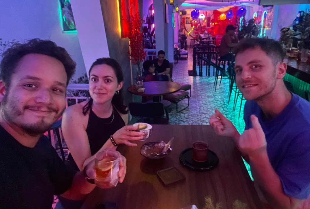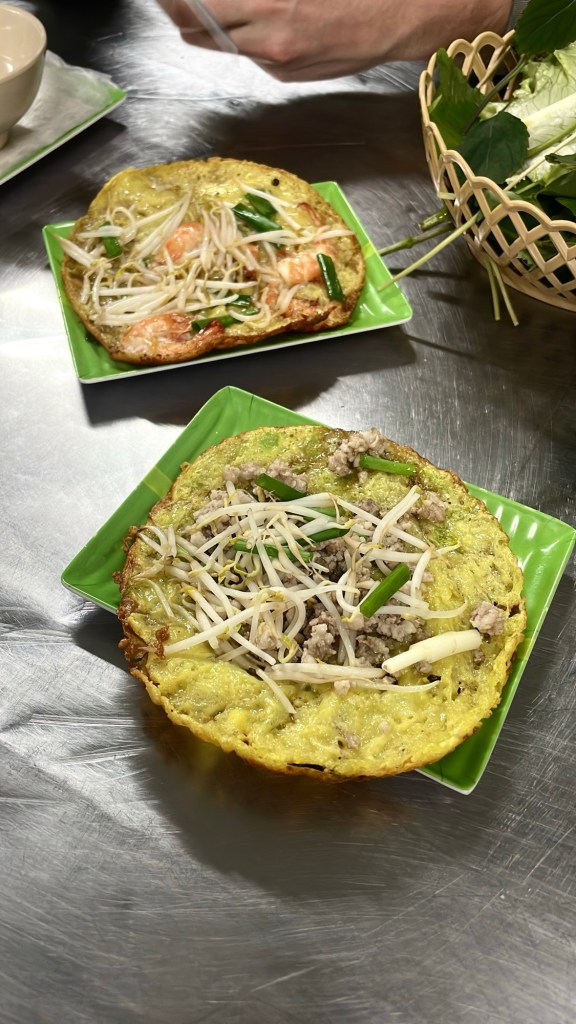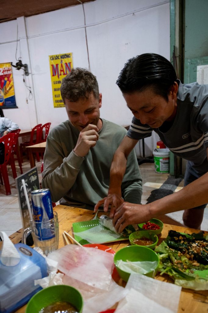 Nous allons ensuite dîner dans un petit boui-boui du quartier où nous mangeons des bo nuong la lot, un plat de bœuf cuit dans des feuilles de la lot (ou feuilles de bétel). Un monsieur du restaurant, très investi, après avoir fumé sa cigarette et s’être touché les pieds, est venu rouler le plat de Clément dans des feuilles de riz, pour lui montrer comment cela se préparait 😅