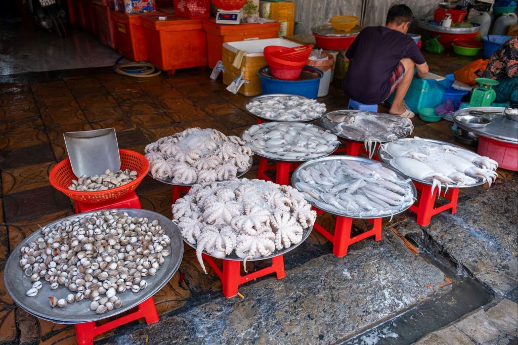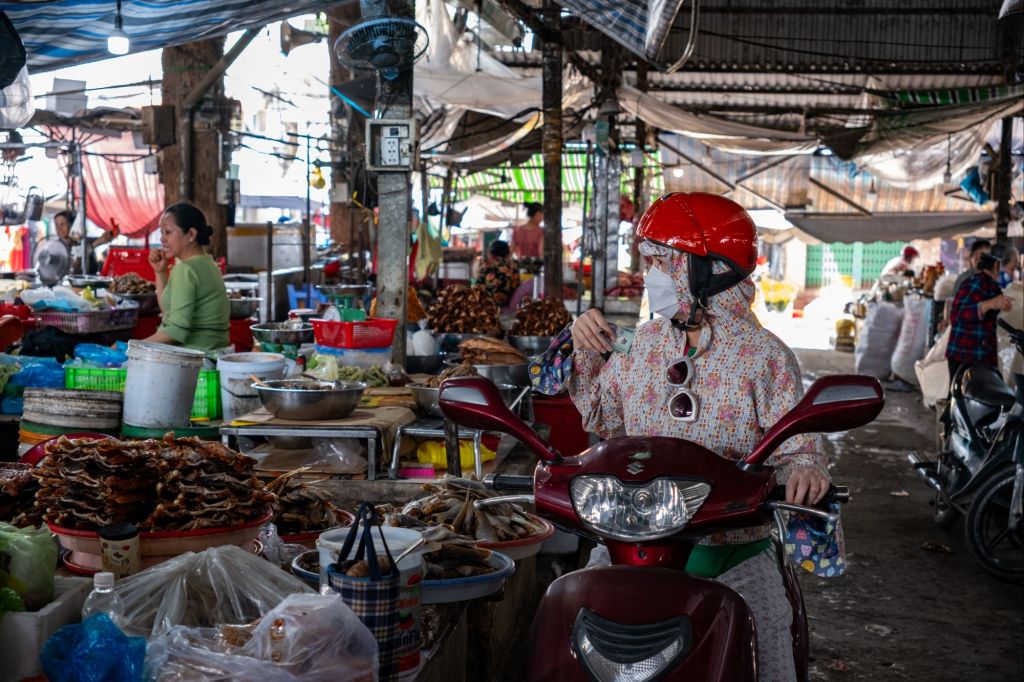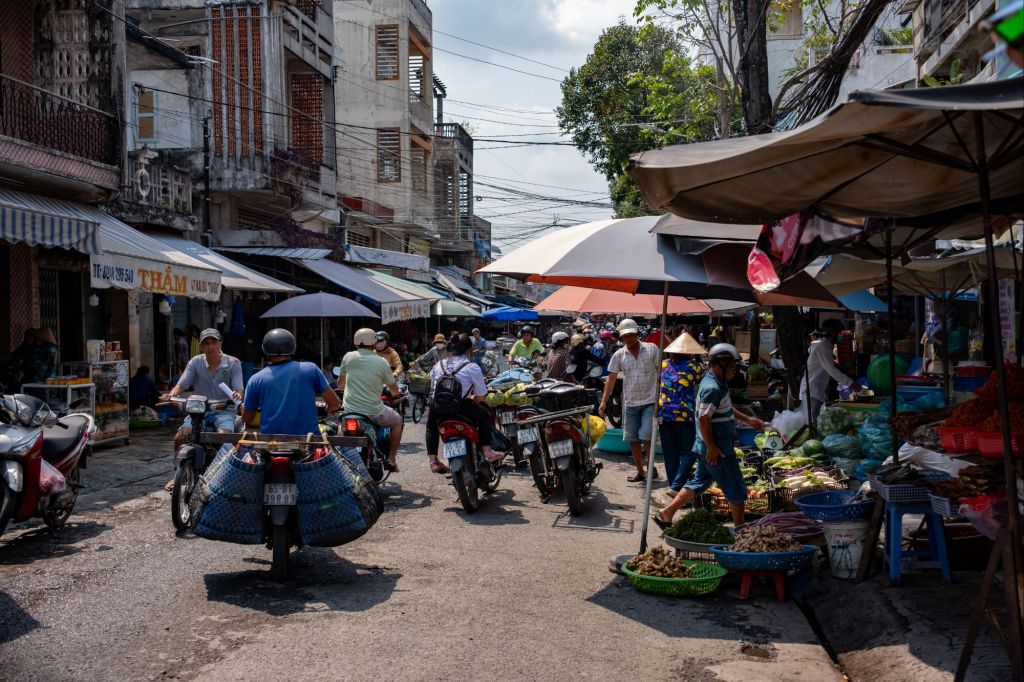 Nous longeons les quais où est installé un énorme marché le long de la rue. Ils vendent de tout : fruits, légumes, viande, et surtout beaucoup de poissons, crabes et même crapauds, qui barbotent dans des grandes bassines. C’est la cohue, des scooters au milieu des vélos et des piétons, le volume sonore est au maximum.