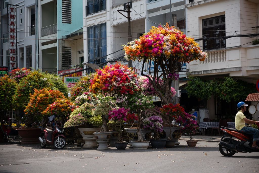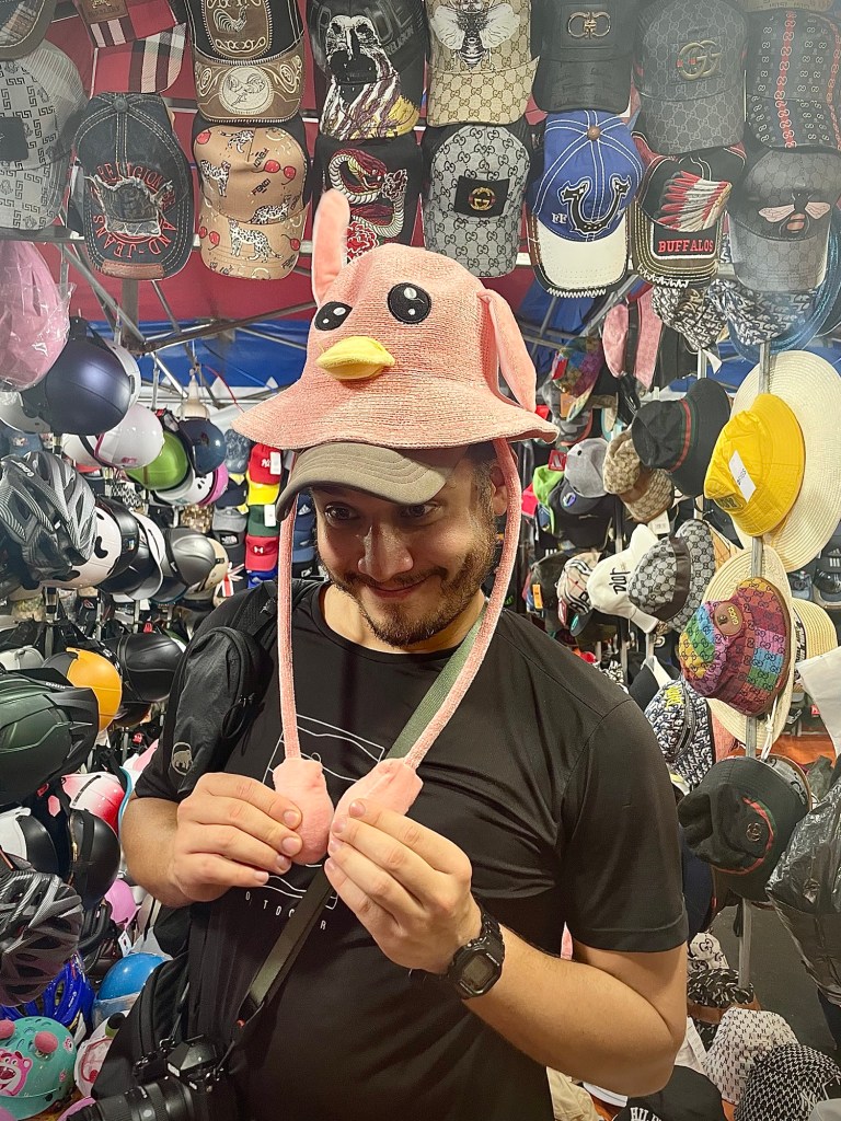 En rentrant à l’hôtel, nous passons nous promener sur le grand marché local qui se situe dans notre rue. On y trouve toutes sortes de confiseries (pour le Têt), et des chapeaux de toutes sortes. Nos préférés : les bobs avec les oreilles qui bougent quand on appuie dessus !