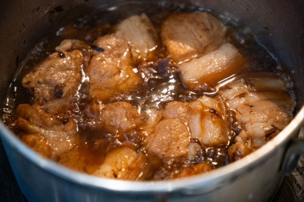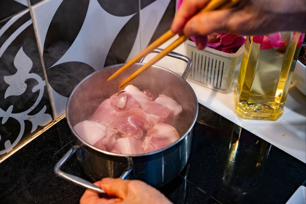 Ce matin, c’est cours de cuisine avec Jacqueline la tante de Guillaume ! Nous apprenons à faire ses spécialités préférées : le thit kho (porc au caramel) et les cha gio (aussi appelés nem ran dans le nord) au porc/crabe/crevette (pâtés impériaux). Nous débutons par le porc au caramel. Il faut faire mijoter la rouelle de porc avec du nuoc-mâm, du caramel et de l’eau de coco.