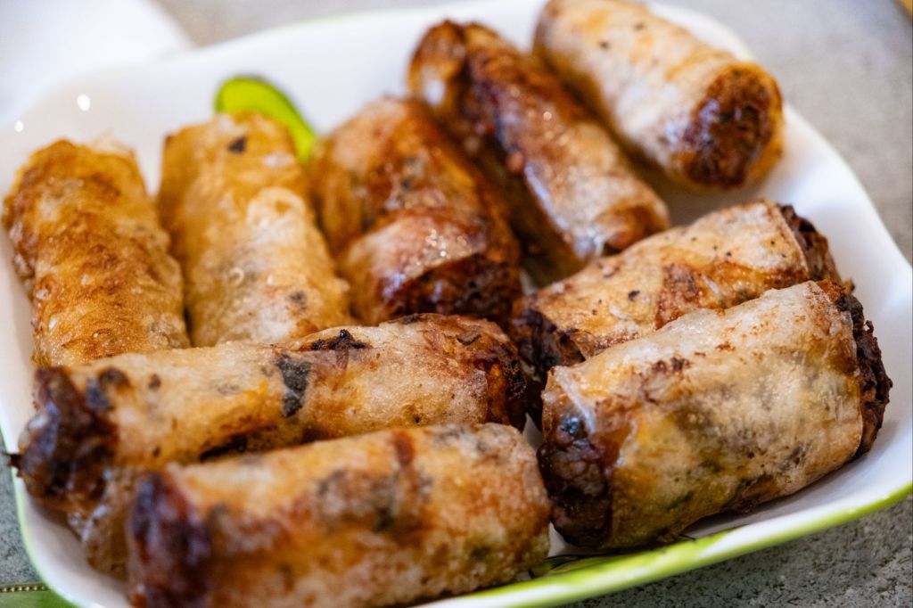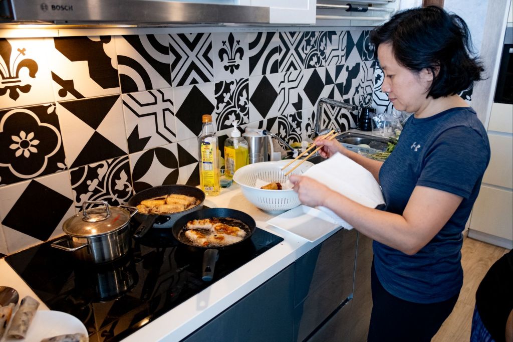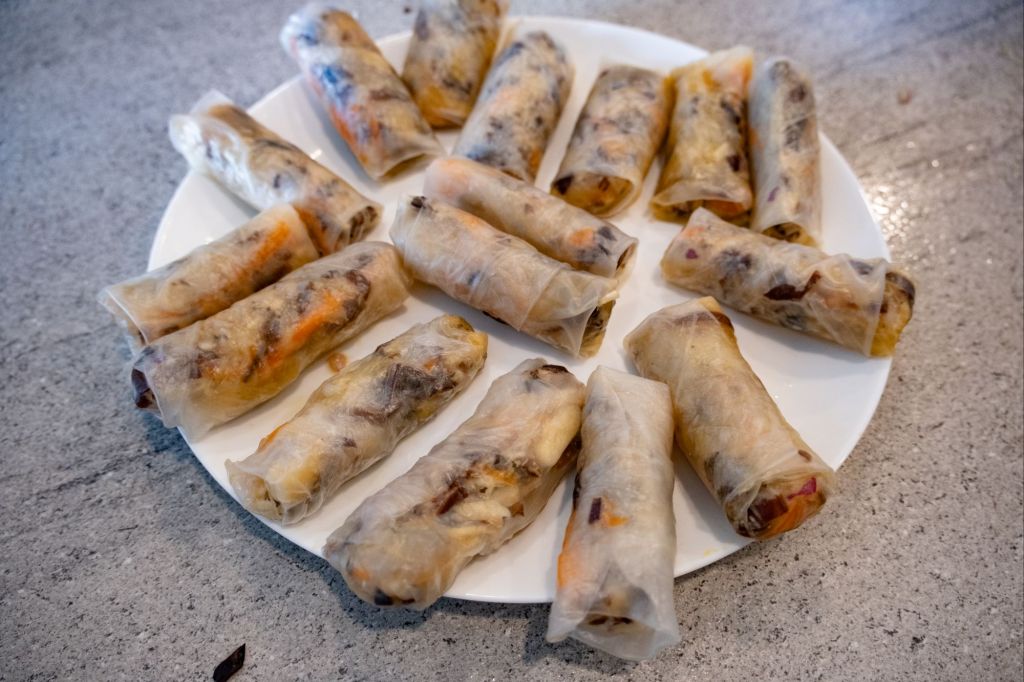 Ensuite, nous préparons la farce des nems, avec des vermicelles de riz, de la chair de crabe, des crevettes, du porc… Nous apprenons à les rouler dans la feuille de riz, puis ils sont d’abord frits dans de l’huile puis cuits au four (pour un résultat extra-crispy !).