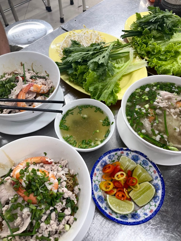 Puis nous faisons une petite séance de sport et sortons manger. Ce soir, nous testons le hu tieu, un plat du sud Vietnam composé d’une soupe avec des nouilles, de la viande et des œufs de caille.