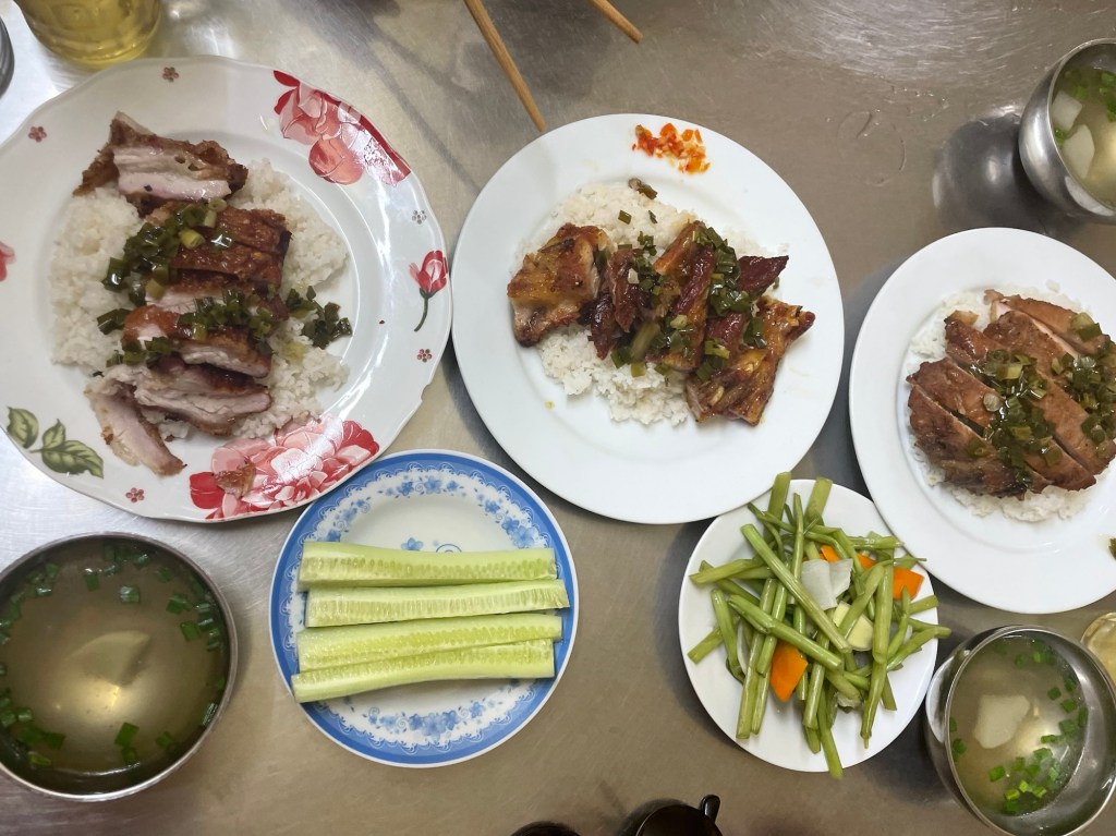 Nous commençons la journée par manger un petit plat de com tam, le porc caramélisé avec du riz brisé, puis allons nous promener dans la ville.