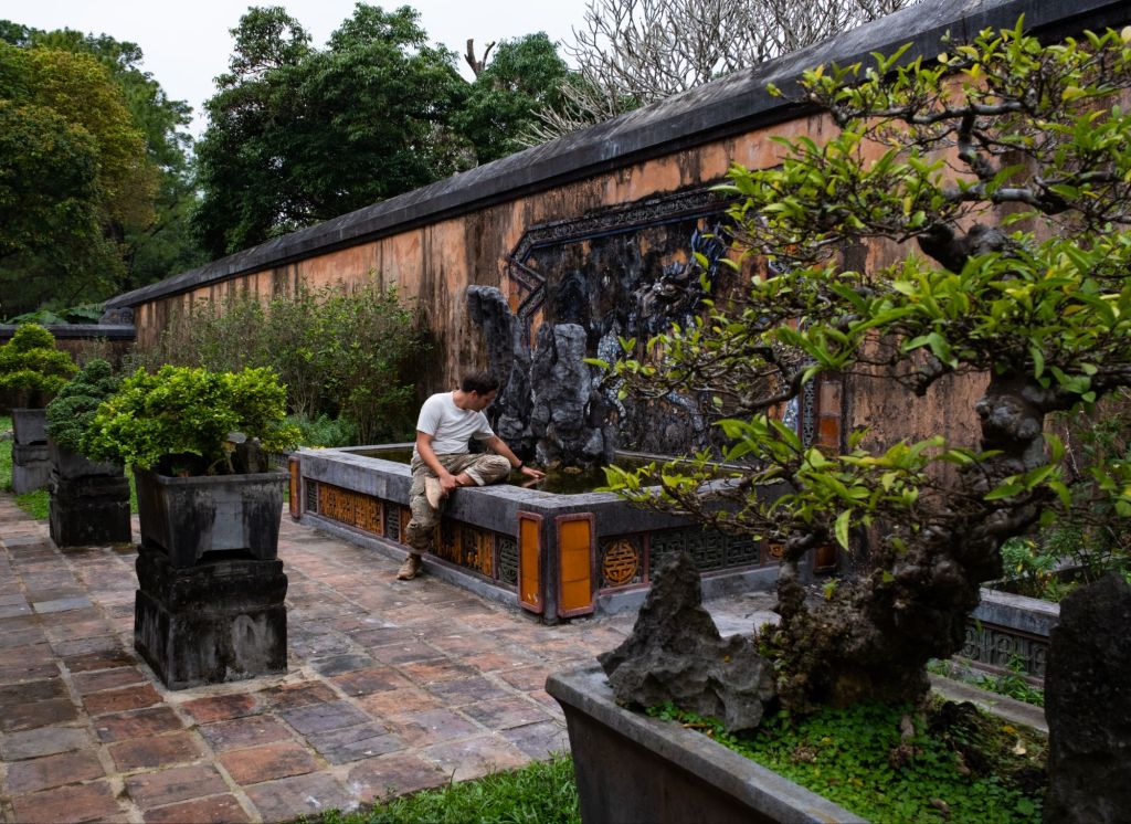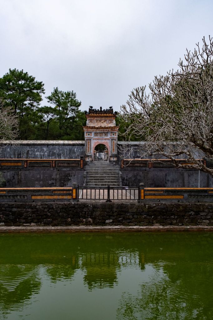 Après ces déboires, nous enfourchons nos scooters et partons avec Paul et Clément à la découverte des tombeaux des anciens empereurs de Hué, au sud de la ville. Nous commençons par le mausolée de l’empereur Tu Duc, construit au 19ème siècle par l’empereur lui-même. Construit au milieu d’un jardin, il lui servait de résidence de campagne où il se reposait avec ses concubines.