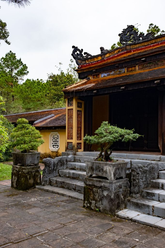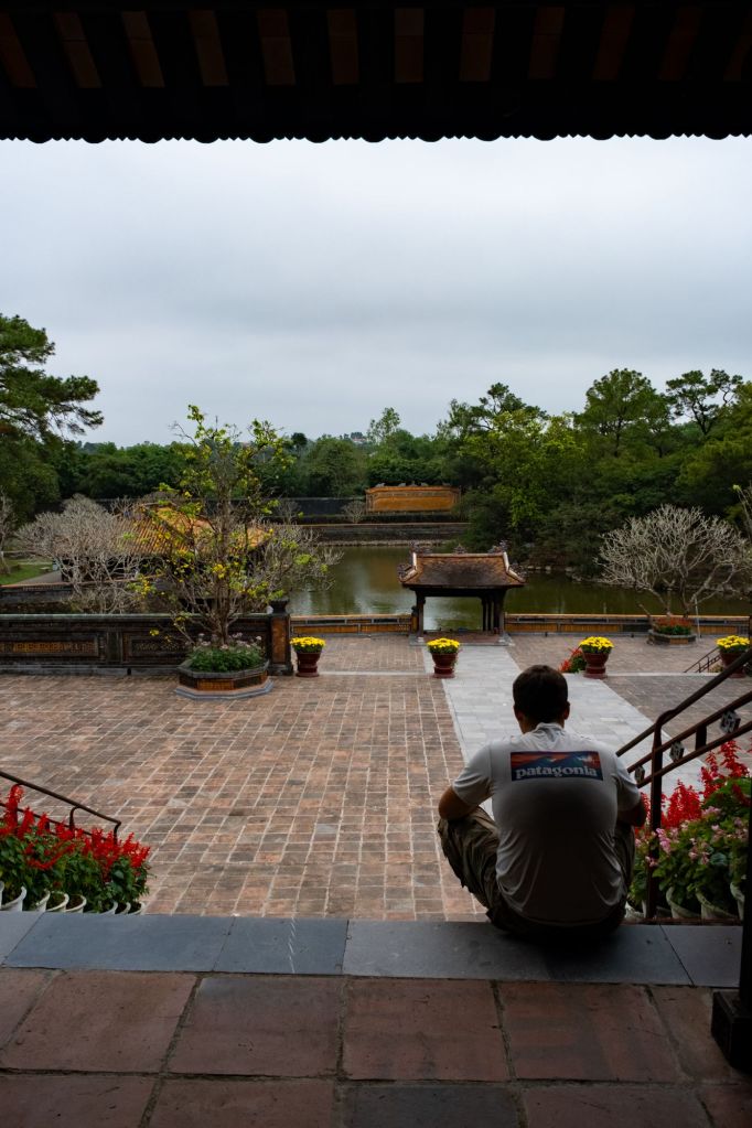 C’est déjà la fin de l’après-midi, nous filons au mausolée de l’empereur Minh Mang. Il est composé de plusieurs temples alignés, entourés d’un grand lac dans lequel nagent des carpes koï. Il faut se dépêcher, car le dernier temple que nous voulons visiter ferme bientôt.