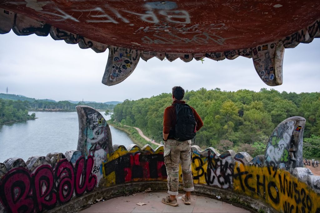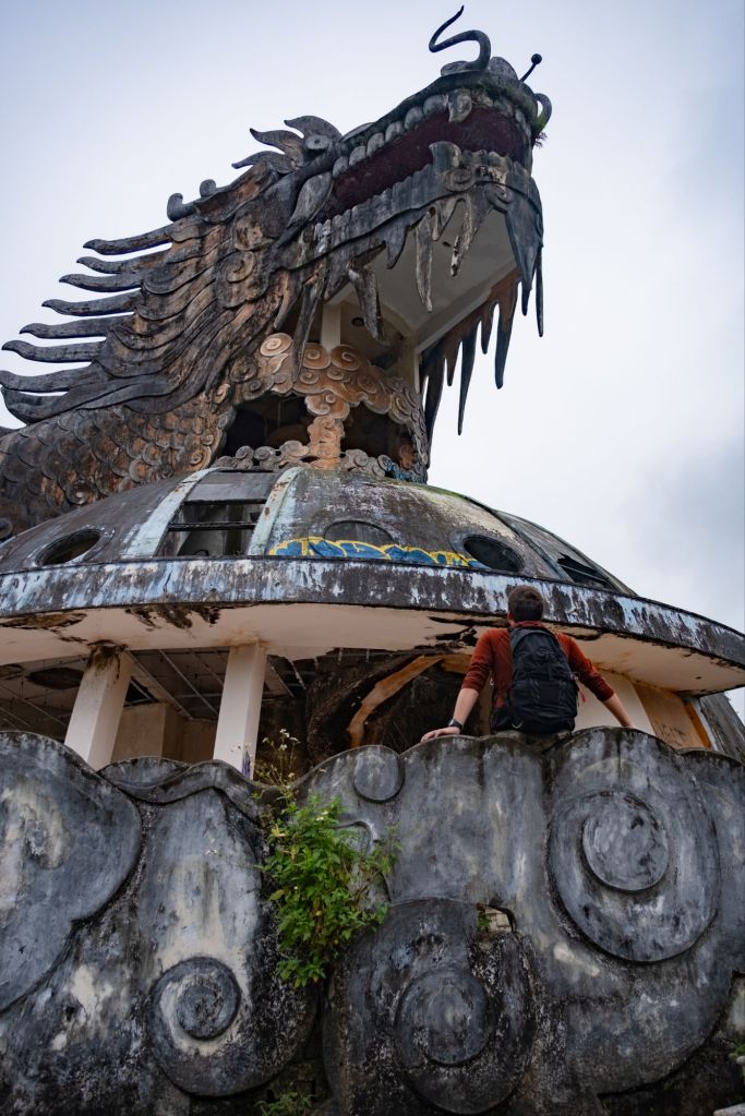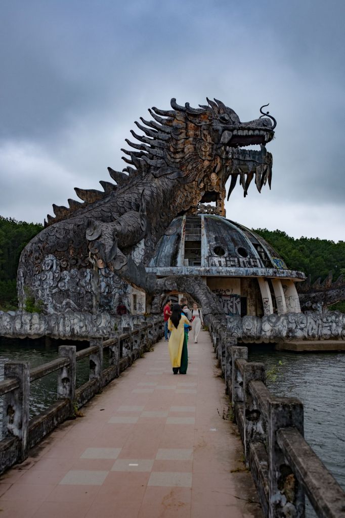 Nous poursuivons en direction du lac de Thuy Tien, au bord duquel se tient un ancien parc aquatique abandonné. Le lieu est mystique. Il fait gris, les nuages sont bas, et un grand dragon en béton se tien au milieu du lac. Comme d’habitude, il y a beaucoup de gens qui se prennent en photo autour, nous sommes loin d’être les seuls sur place, mais l’endroit semble irréel.