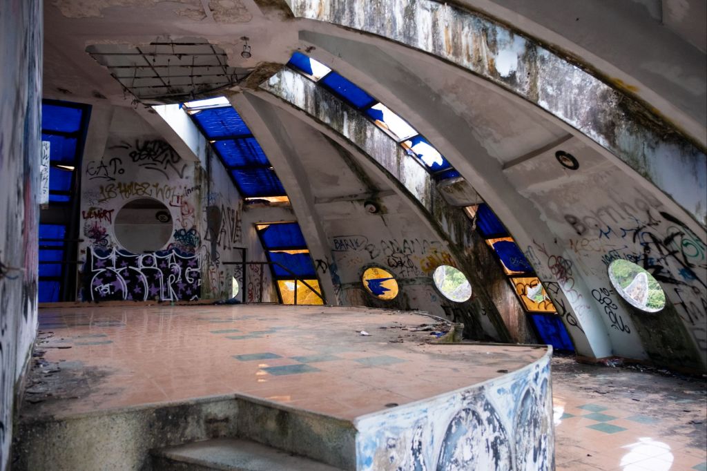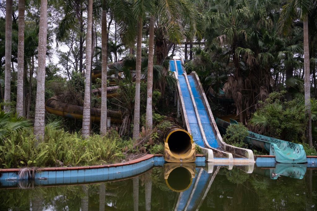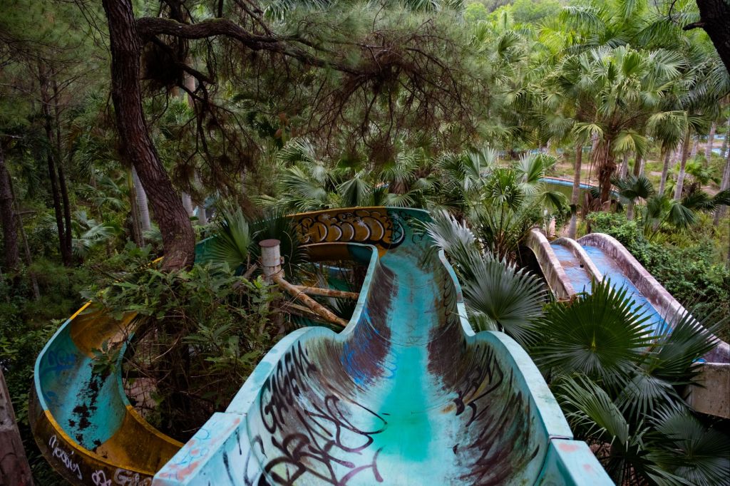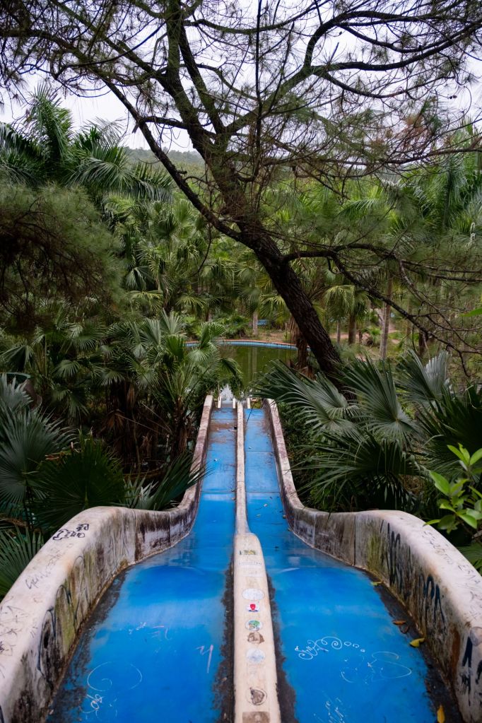 De l’autre côté du lac, un peu plus reculés, se trouvent les toboggans abandonnés, et nous sommes seuls cette fois-ci, avec l’impression de faire de l’urbex.