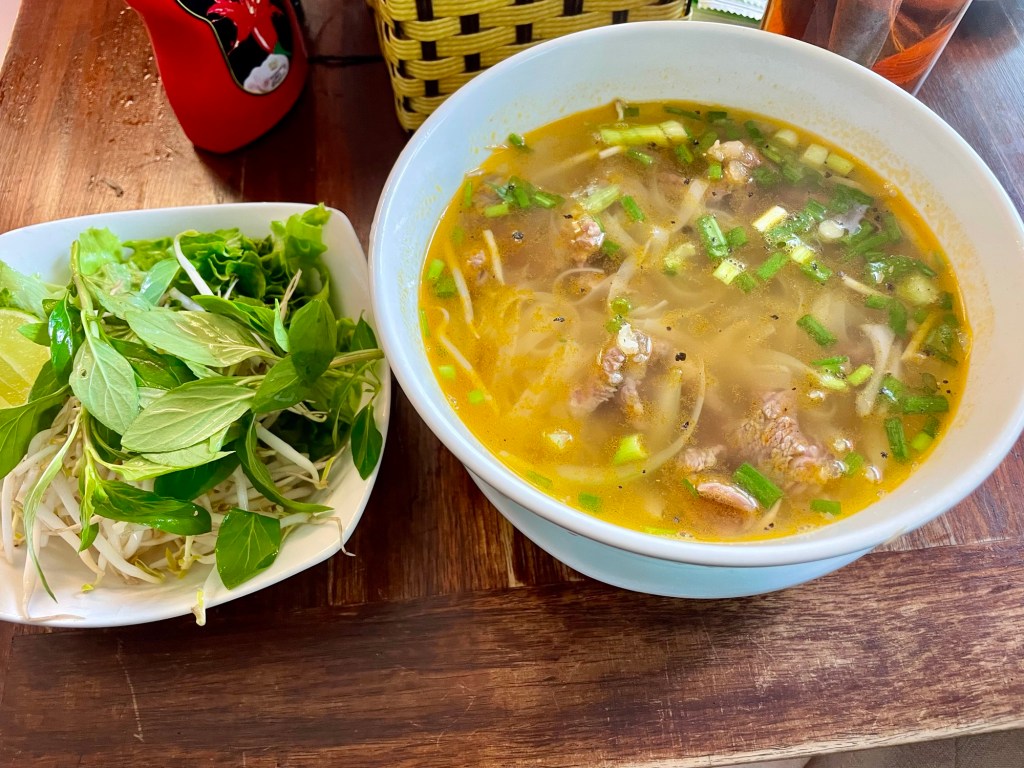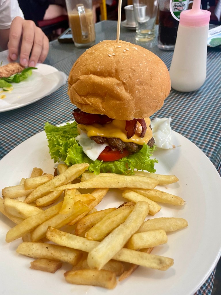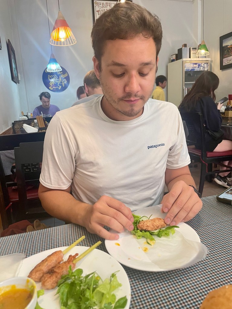 Ce matin, nous sortons petit-déjeuner en bas de notre hôtel, au Cafe on thu wheels. Ils font un mélange de plats asiatiques et de plats occidentaux, nous prenons un burger et des nem nuong.
