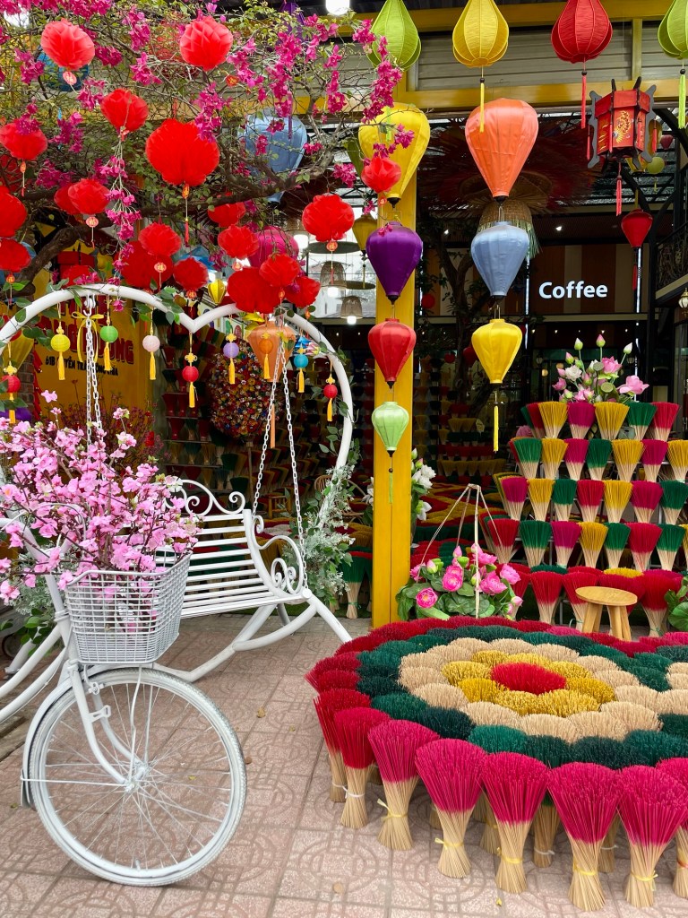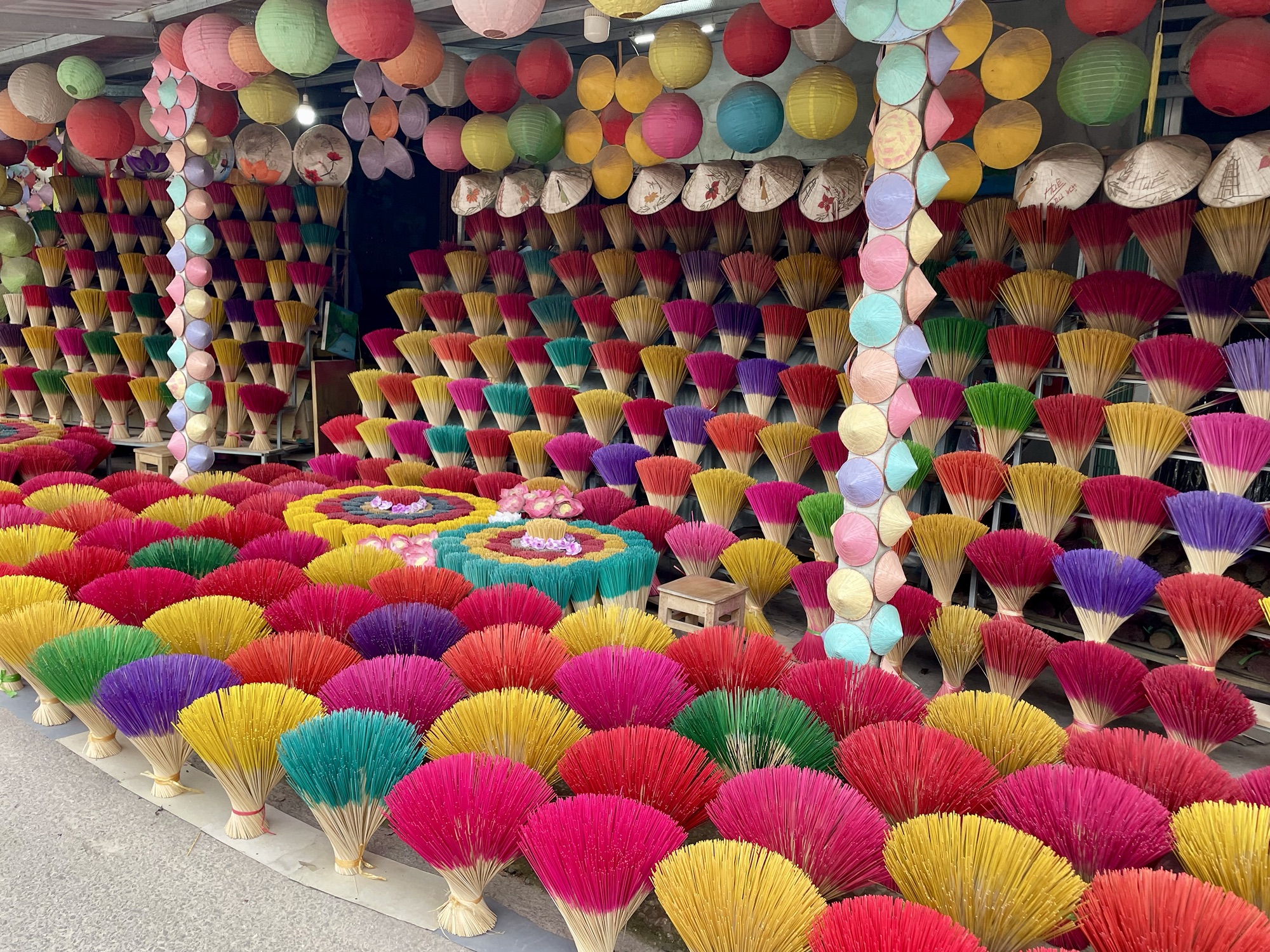Juste à côté, nous passons au village de l’encens, Thuy Xuan. Malheureusement il n’y a plus rien d’authentique, il n’est même plus possible de voir la fabrication. Il ne reste plus qu’une rue de boutiques présentant de l’encens coloré, où il est possible de prendre des photos devant (le sport préféré des vietnamiens). Après 2 photos, nous passons notre chemin.