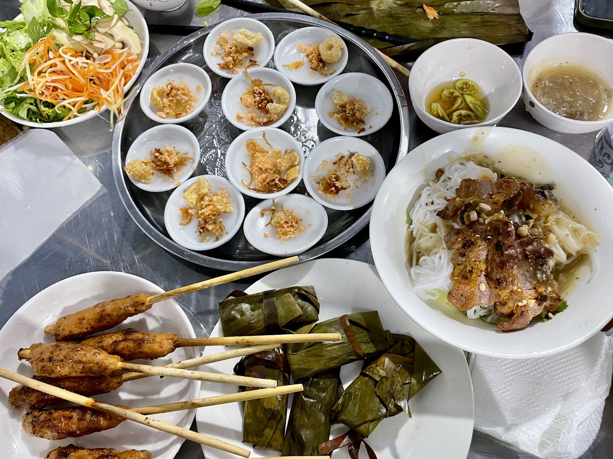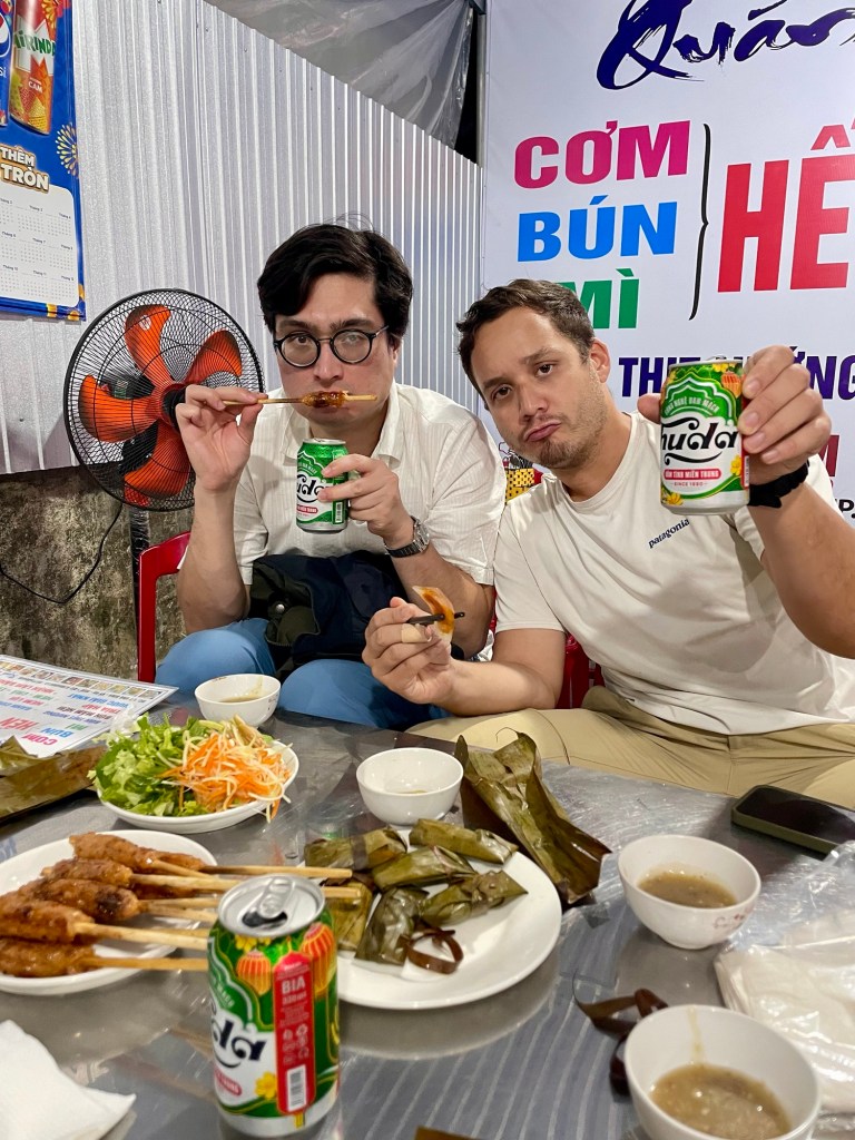 Le soir, nous marchons une bonne demie heure jusqu’à l’île de Con Hen, située entre les deux rives de la ville de Hué, dans l’idée d’aller manger dans un restaurant qui nous avait été conseillé, mais nous trouvons porte close. Nous allons donc au petit boui-boui du coin de la rue, Quan An No, où nous goutons quelques spécialités de la région : les nem lui, banh beo, banh nam et bun thit nuong.