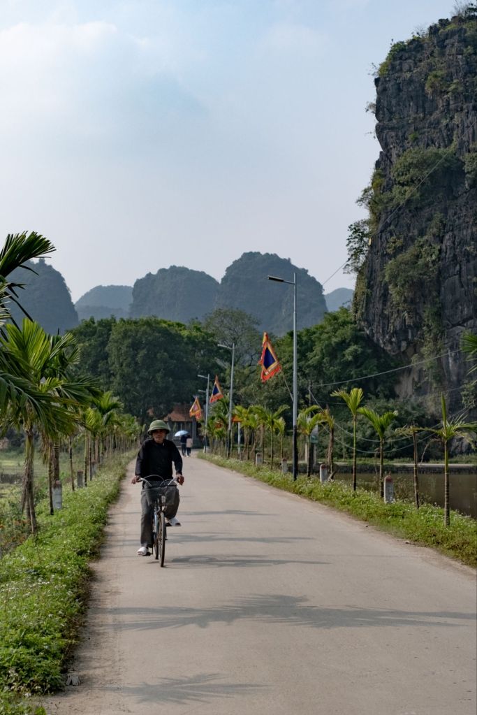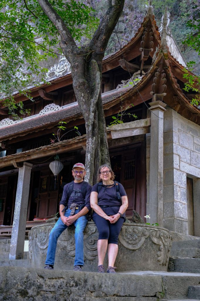 Ce matin, nous profitons du délicieux petit déjeuner de l’hôtel, qui est gargantuesque et très bon ! Puis nous enfourchons les vélos de l’hôtel, et nous dirigeons vers la pagode de Bich Dong. Le chemin est très beau, et la pagode est nichée au milieu des montagnes, une partie du temple est même dans une grotte.