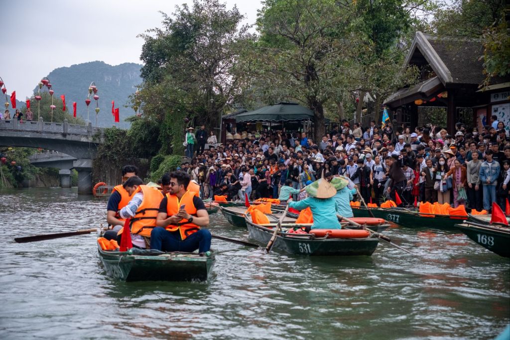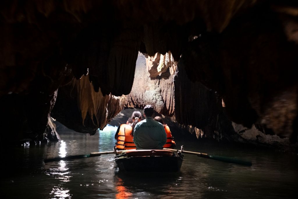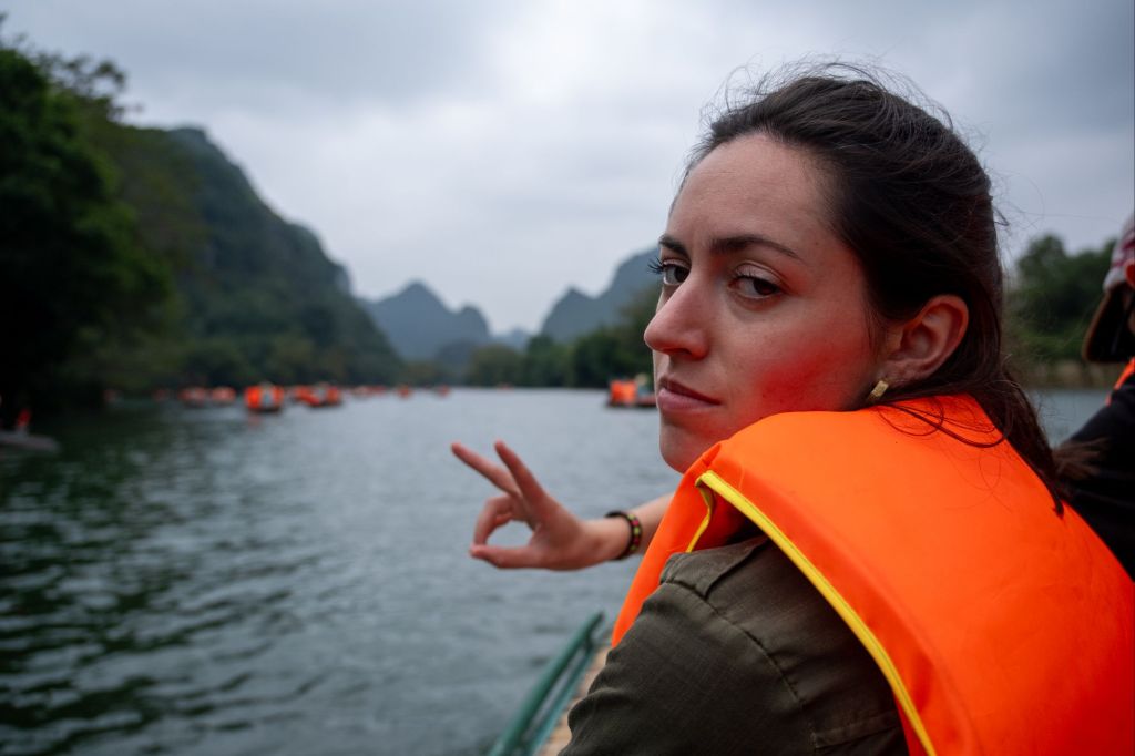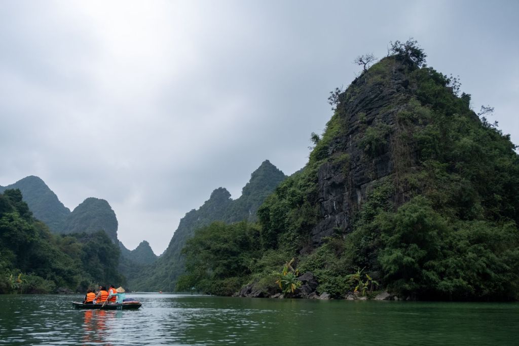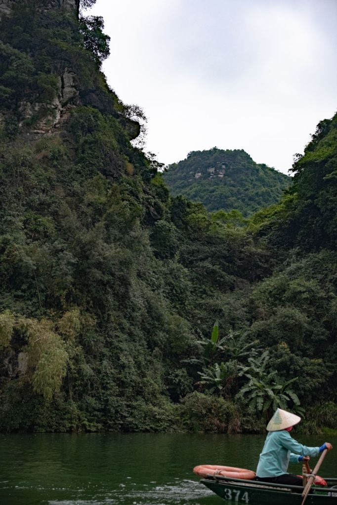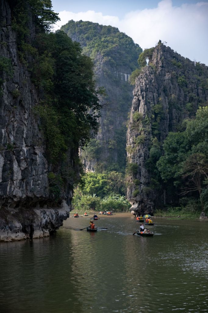 Nous déjeunons au bord de la route dans un petit boui-boui de bun cha. Et nous allons à Trang An, un des sites les plus touristiques, et pour cause : c’est une promenade en bateau d’environ 3h au milieu des massifs karstiques. Arrivés là-bas, nous ne sommes pas déçus, ça crie comme à la foire dans des mégaphones pour diriger la foule, les quais sont remplis à ras bord et tout le monde se jette dans les petites barques à leur arrivée… Une fois sur l’eau, nous nous suivons tous, avec nos gilets oranges. Pas vraiment le genre de balade que nous apprécions d’habitude. Mais le paysage est vraiment magnifique.