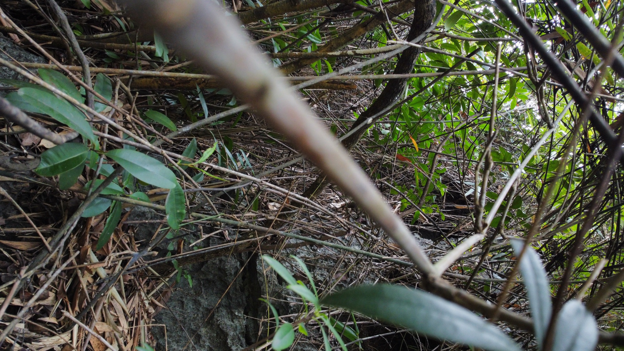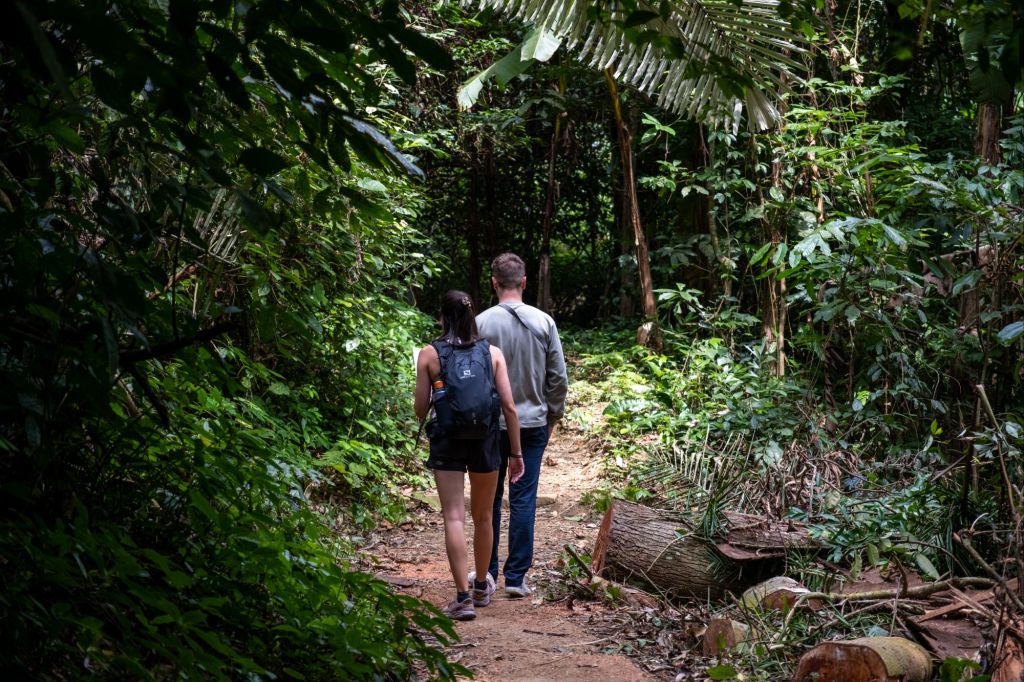 La forêt est dense et belle, les grands arbres, envahis par les lianes et les fougères, côtoient les bananiers et les palmiers. Sur le chemin, nous visitons une petite grotte à la lueur de nos téléphones.