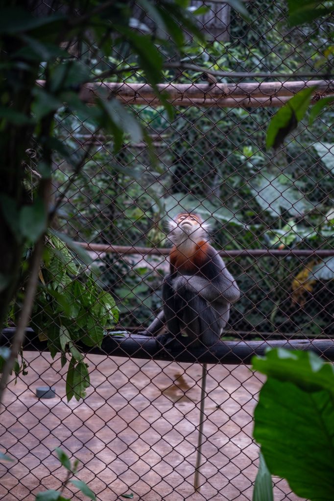 Après avoir grignoté quelques gâteaux sur le pouce (les délicieux ChocoPie), nous filons visiter le centre de conservation des primates en voie d’extinction du parc. C’est le plus grand centre du Vietnam, il recueille les singes en voie d’extinction afin de les soigner et de les relâcher dans la nature. Nous avons pu voir des gibbons et surtout des langurs (de très jolis singes de différentes couleurs avec de longues queues).