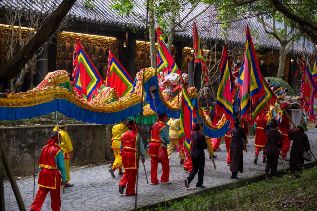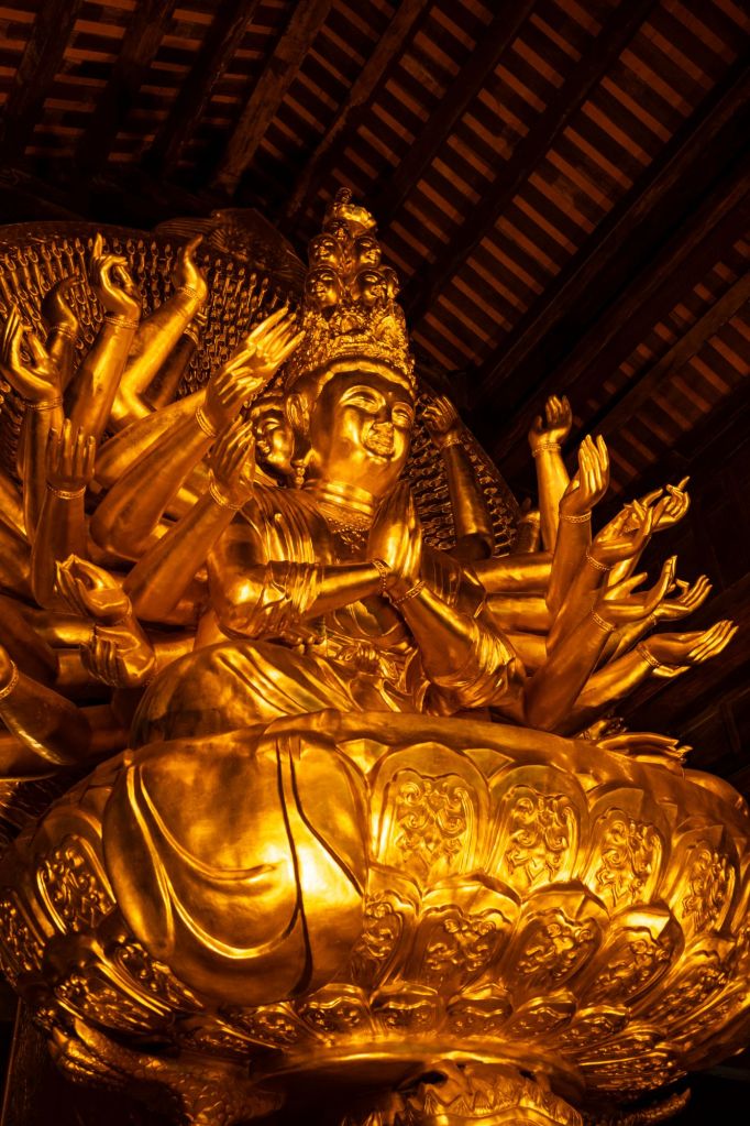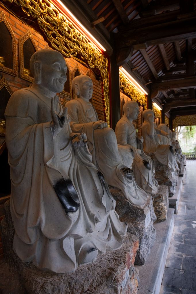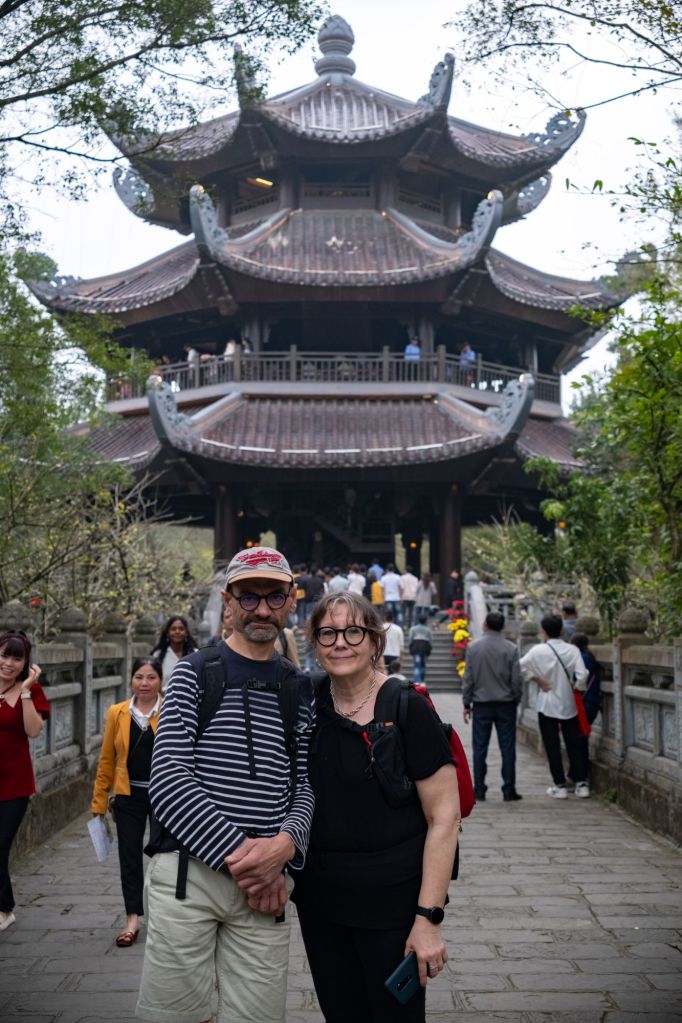 Aujourd’hui, départ tôt pour tenter d’éviter la foule sur les gros sites touristiques. Notre chauffeur nous emmène d’abord à la pagode Bai Dinh. À l’arrivée, il y a une énorme foule de vietnamiens, tout le monde se bouscule, il y a un brouhaha d’enfer. Nous accédons à l’entrée du site par des petites voiturettes électriques, il y en a des dizaines et des dizaines qui se croisent, c’est un ballet bien organisé. À l’intérieur, nous assistons à un spectacle traditionnel, puis nous visitons plusieurs temples.