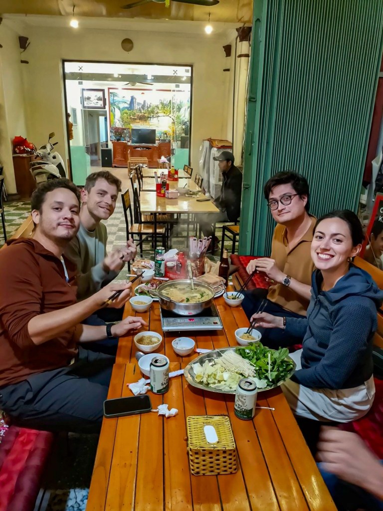 Le soir, affamés, nous commandons au Ngoc Linh Restaurant un grand hot pot à partager tous ensemble et beaucoup trop d’accompagnements !