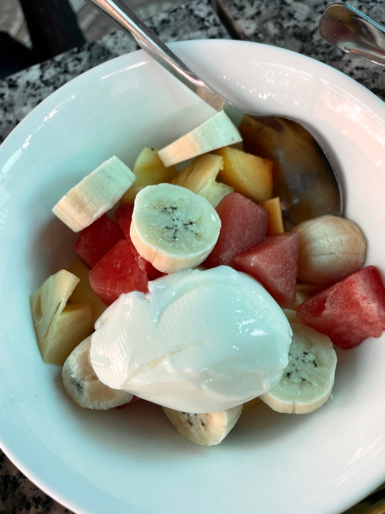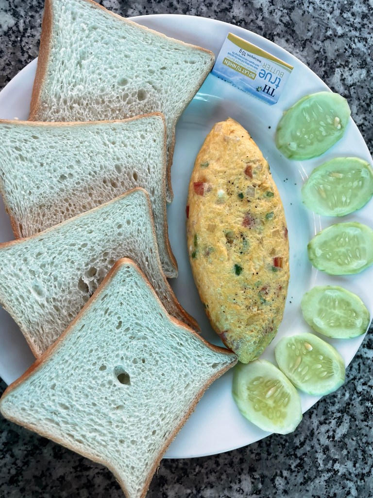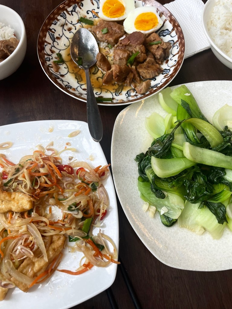 Nous allons déjeuner au FatherCooking Restaurant, un bon restaurant de spécialités asiatiques et occidentales bon marché. Nous avons pris du porc au caramel, du tofu frit, des légumes et des nems, c’était délicieux !